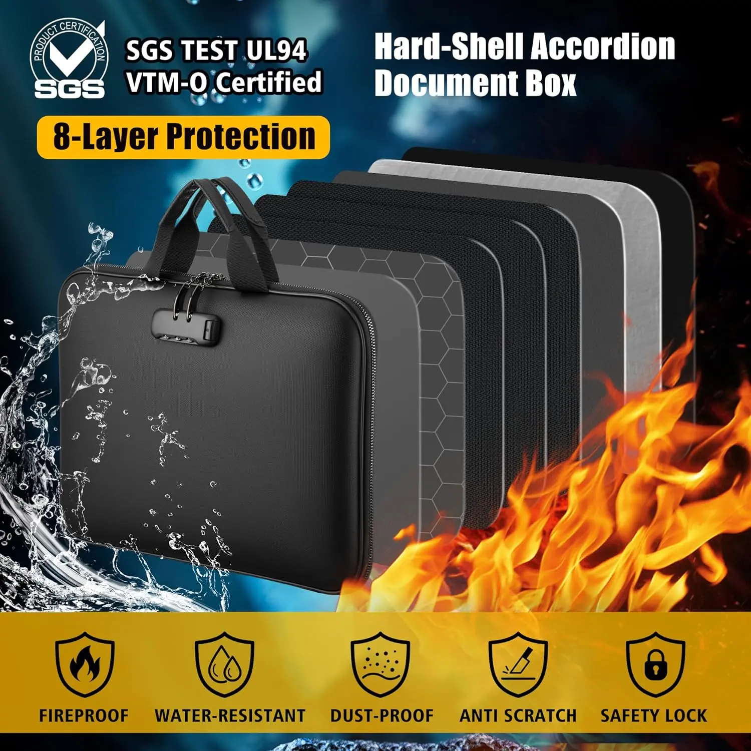 Hard-Shell (SGS Certified): Our fireproof document box provides unmatched structural integrity. Unlike soft cases, the hard-shell construction maintains its form even under . It has proudly passed the SGS TEST (UL-94 VTM-0 Test), confirming reliable fire resistance.