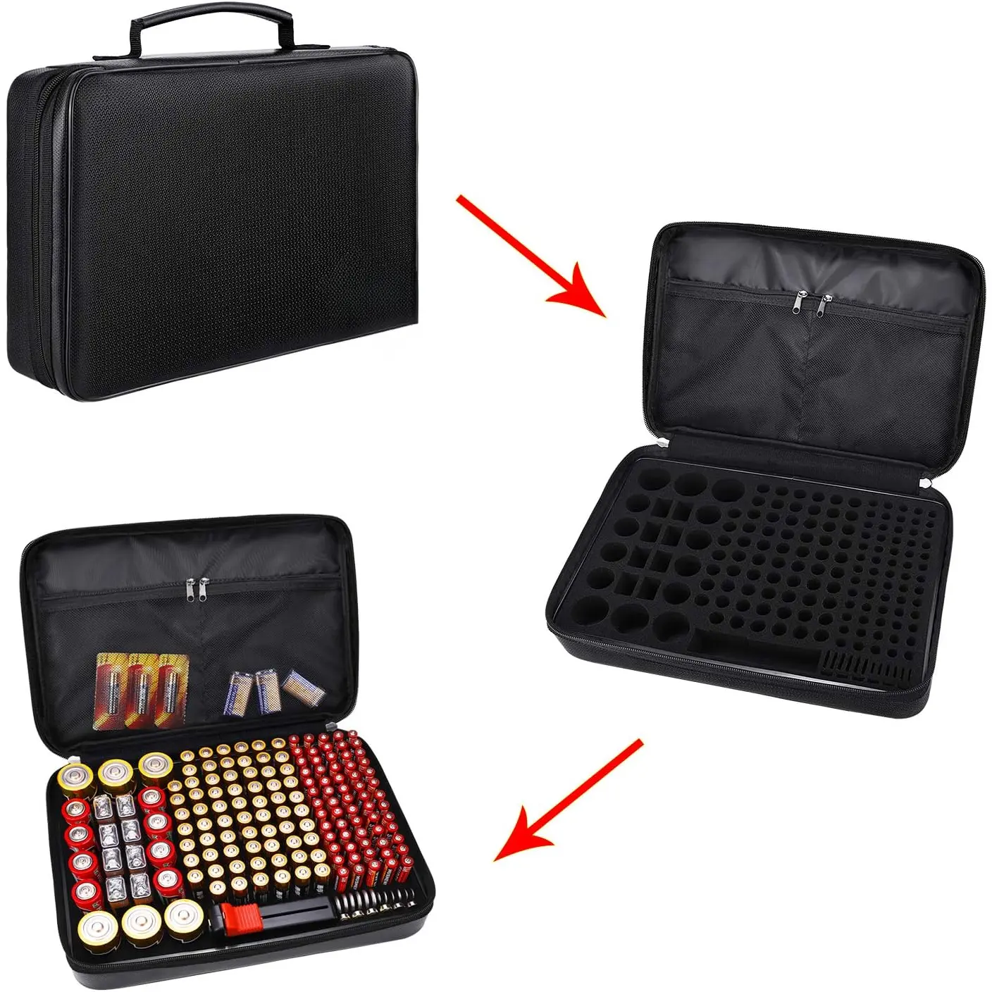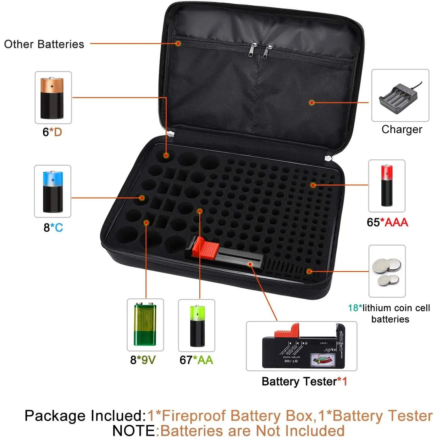 [ Storage Box]: Keep the batteres in place in the pre- slot and prevents the contact ends from touching each other. case can hold, 67 * , 65 * AAA, 8 * c, 6 * d, 8 * 9v, 18 * button , 1* Tester, total over 172 and we designed 2 pockets for you to store for your , equipment, remote control, Christmas , etc.