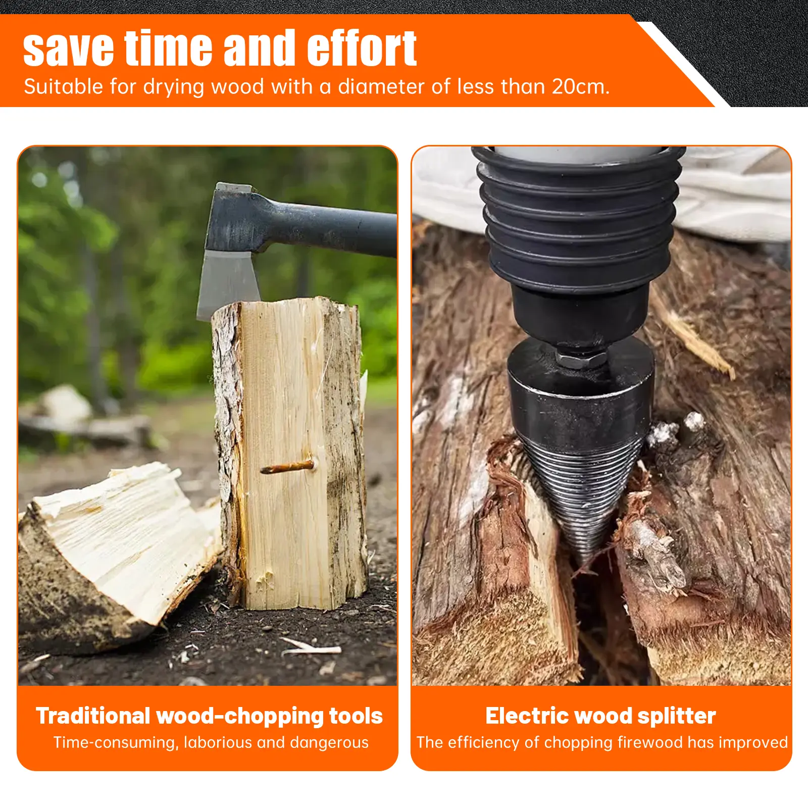 No more exhausting swings with an axe-our drill bit splits logs quickly and efficiently, turning firewood preparation into a simple task that saves both time and effort.
