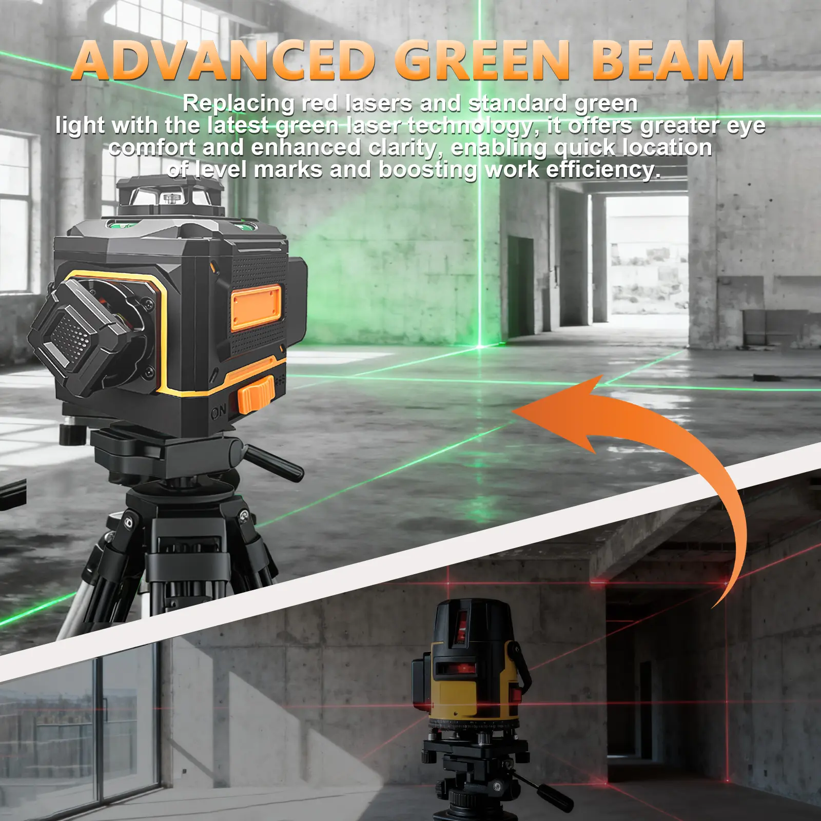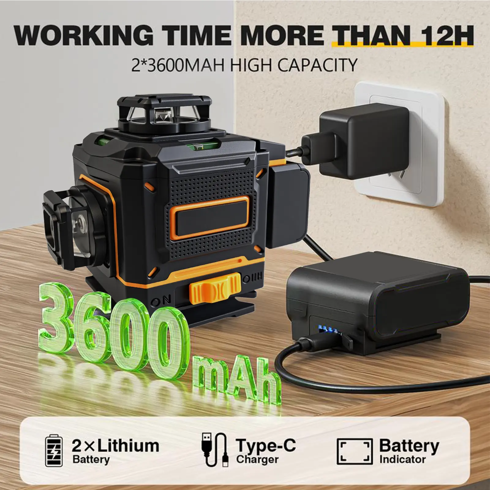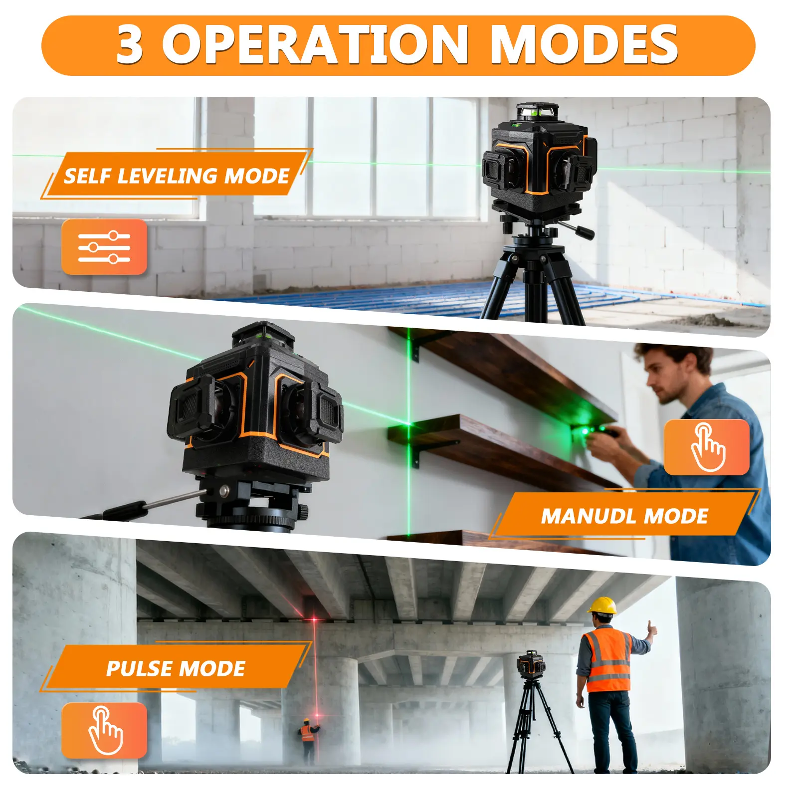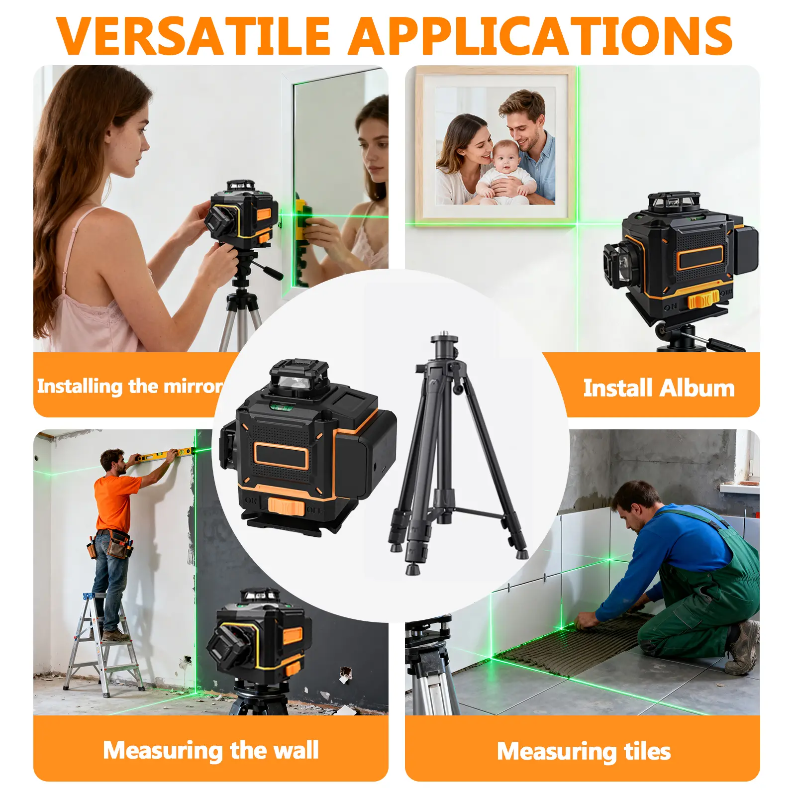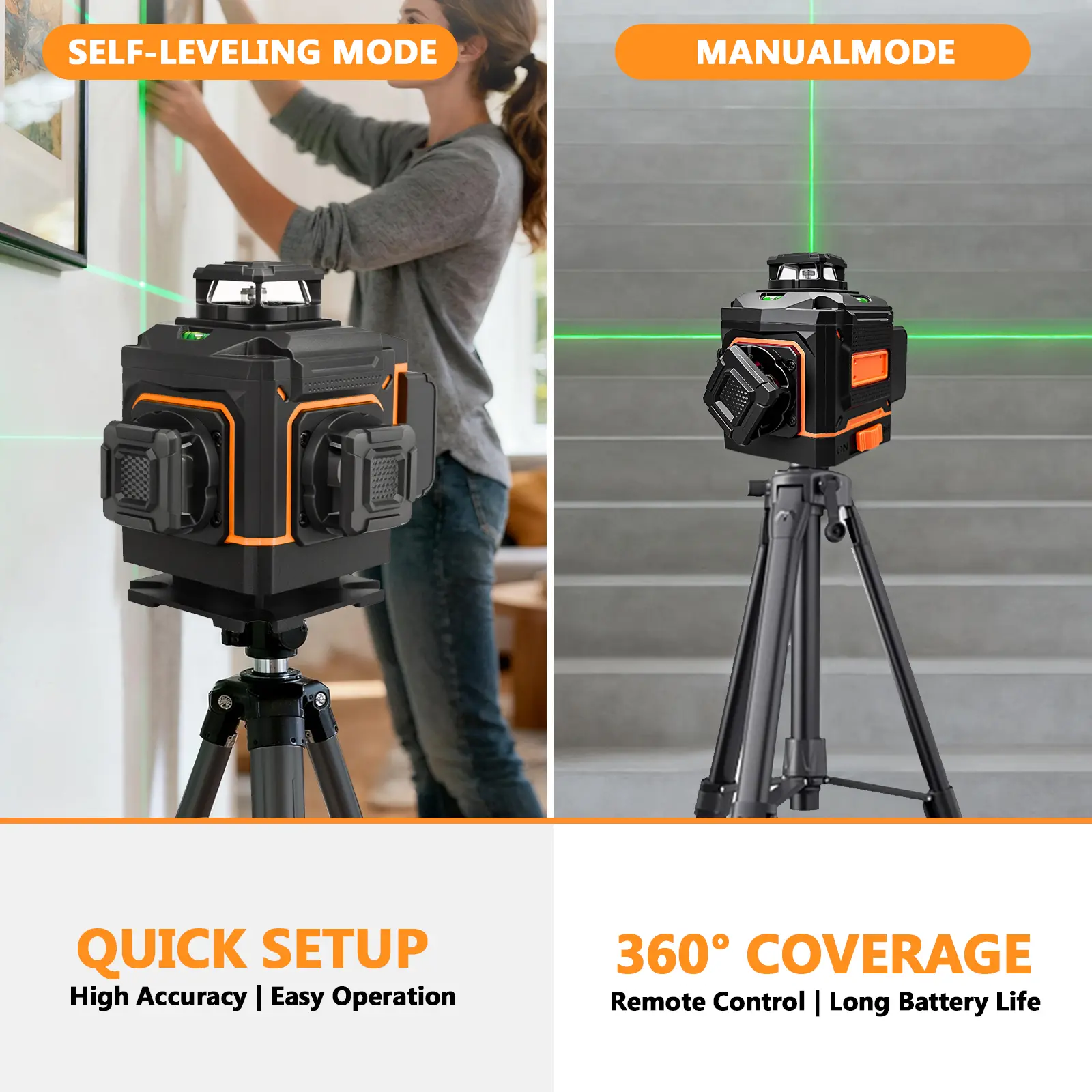 Laser Lines: 4×360° (16 lines total, 4D) — Two 360° horizontal floor laser lines & Two 360° vertical laser lines