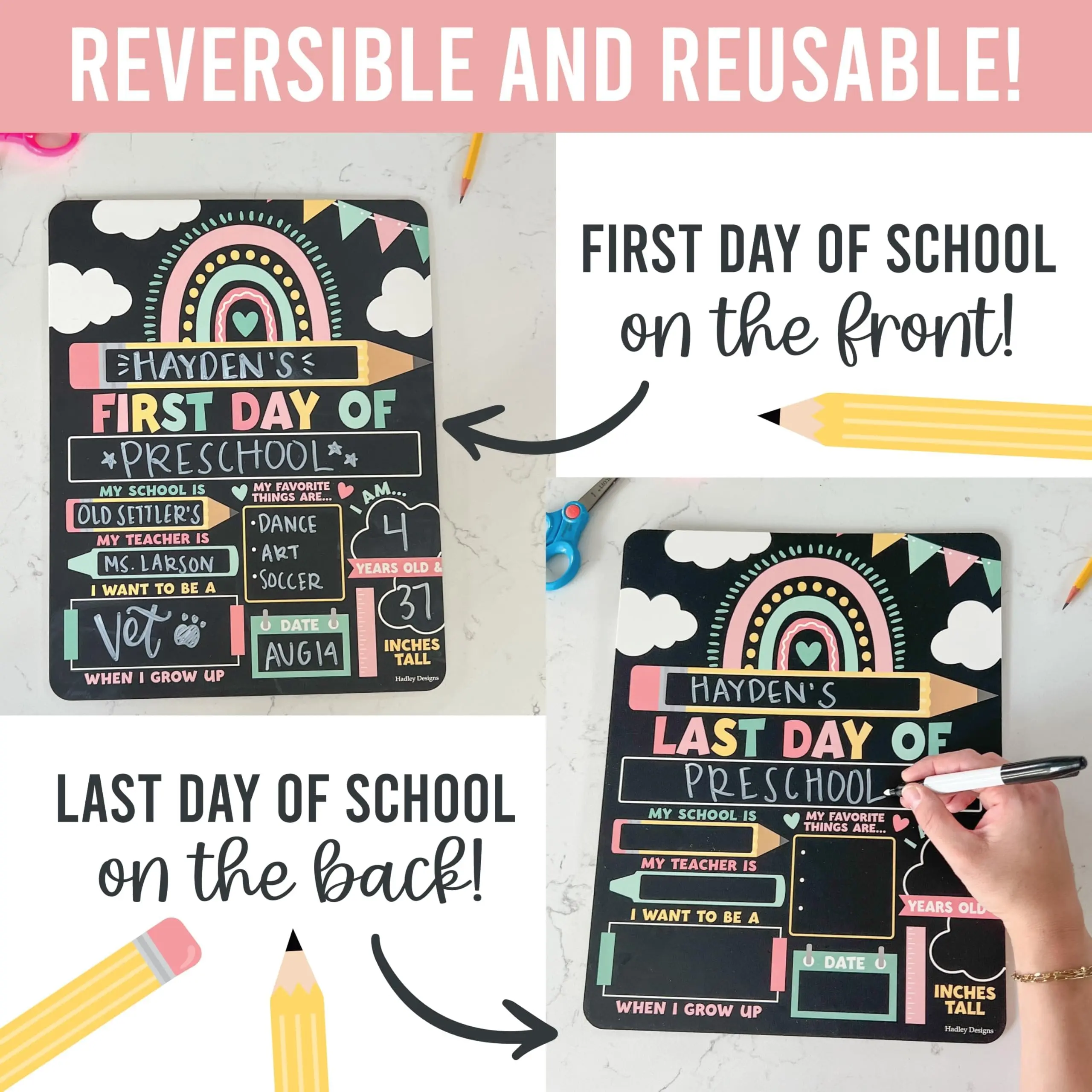 11x14 Inches—Double-Sided First And Last Day Of School Board, Includes One Non-Toxic, Erasable Marker. Easy to write on and erase! You'll receive one reversible 11x14 inch board with one eraser. It’s the ideal size for capturing first and last-day-of-school photos.