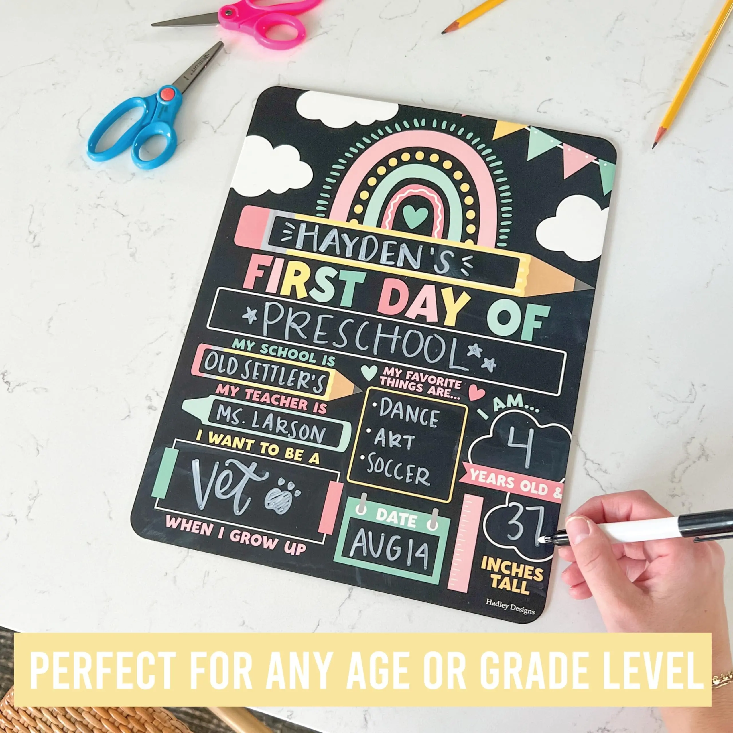 If you're looking for a fun back-to-school tradition, this first day of school board is designed with love and attention to detail in the USA. It's the perfect tool for recording special moments before they pass. Document your child's growth with this back-to-school chalkboard sign.