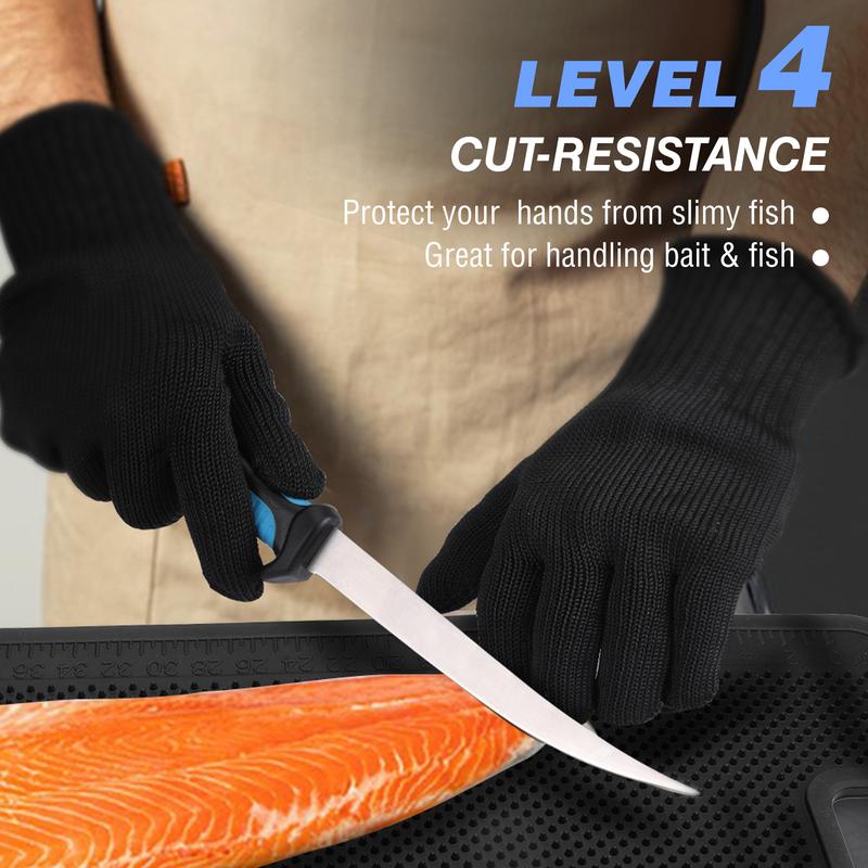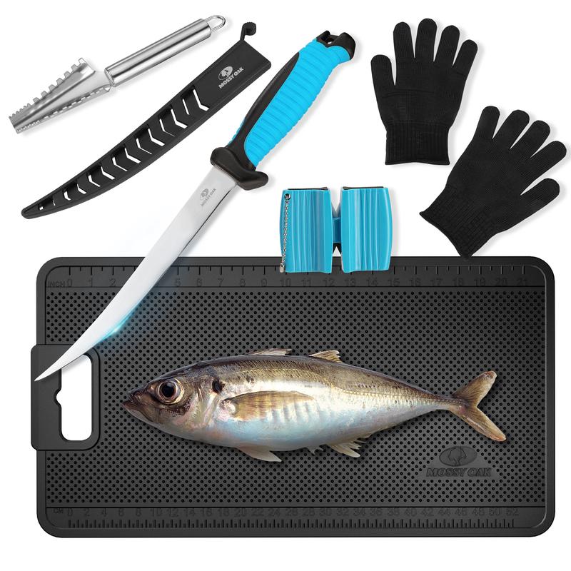 ·Complete Fish Filleting Kit: The 5-piece fish cleaning set includes a 7" fillet knife, non-slip fish cleaning mat (24" x 13"), a pocket knife sharpener, a stainless steel fish scaler remover, and cut-resistant gloves. This all-in-one fishing kit is a must-have for anglers, offering convenience and protection for a hassle-free fish cleaning experience