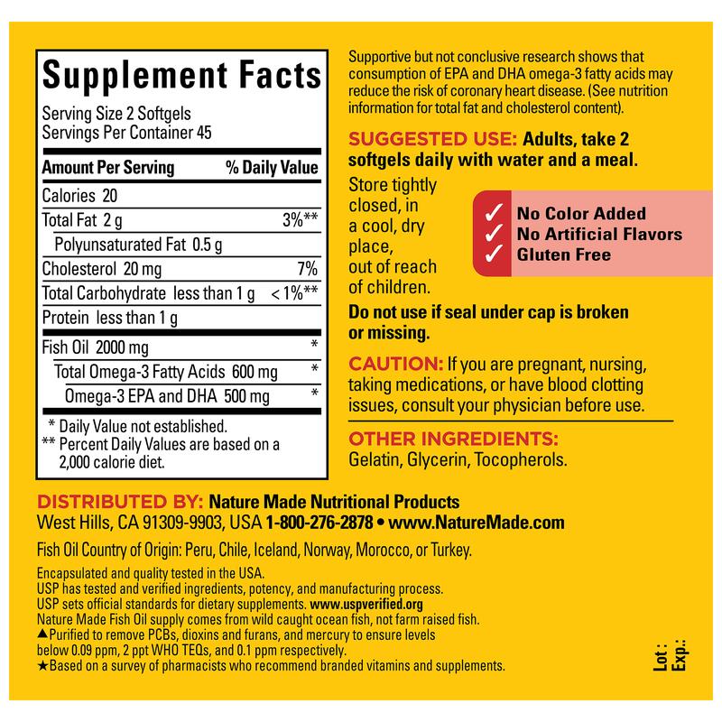 Nature Made® Fish Oil provides 1000 mg (300 mg Omega-3) per softgel for a total of 2000 mg (600 mg Omega-3) per daily serving. The Omega-3s (EPA and DHA) in fish oil help support a healthy heart.†