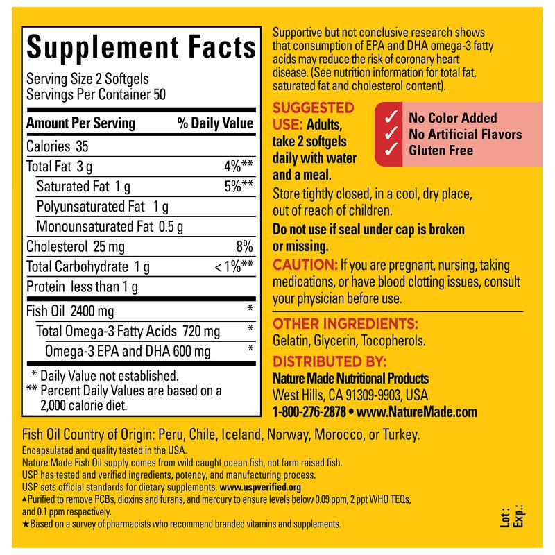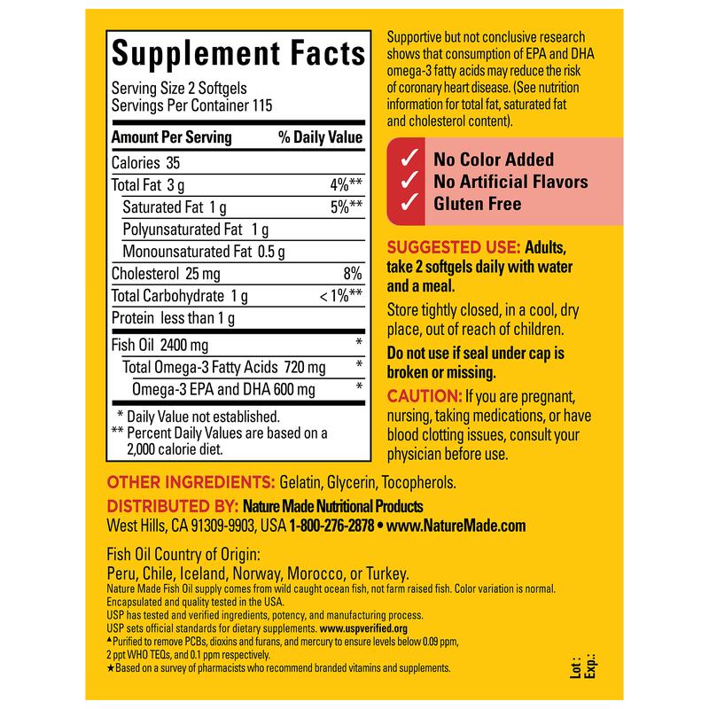 Nature Made® Fish Oil provides 1200 mg (360 mg Omega-3) per softgel for a total of 2400 mg (720 mg Omega-3) per daily serving. The Omega-3s (EPA and DHA) in fish oil help support a healthy heart.†