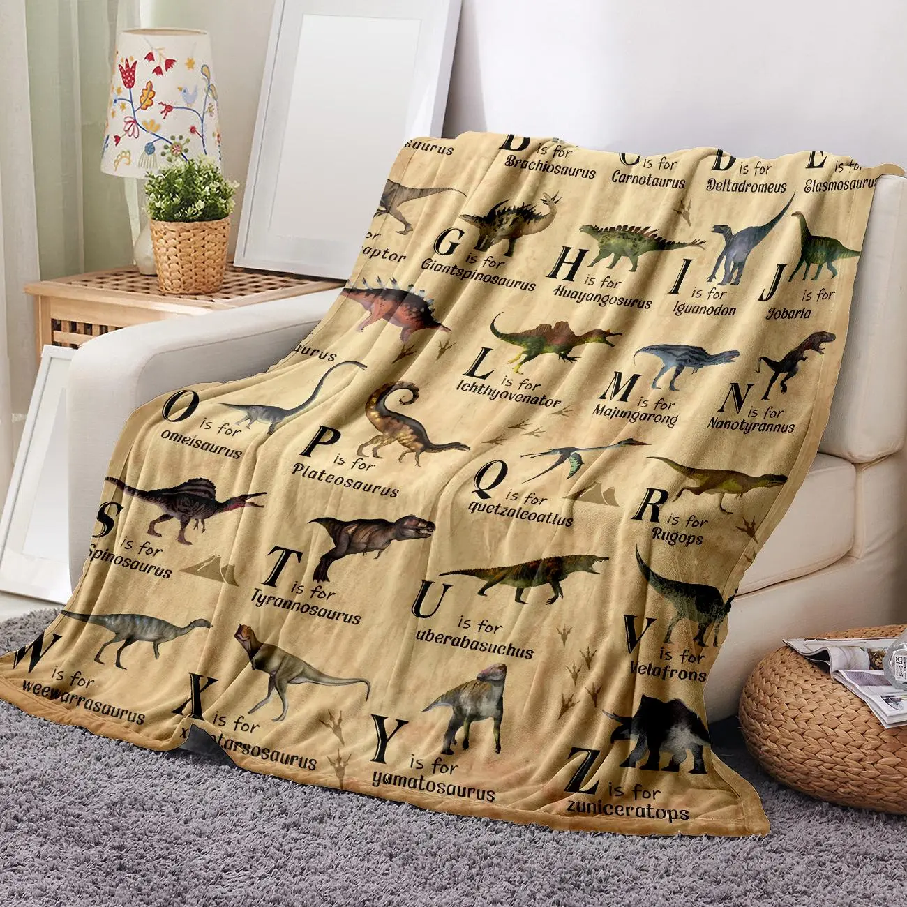 I bought the dinosaur blanket for my granddaughter. She loved it. Super soft. Thin. Make good summer blanket. Had 26 dinosaurs one for each letter in alfabet.