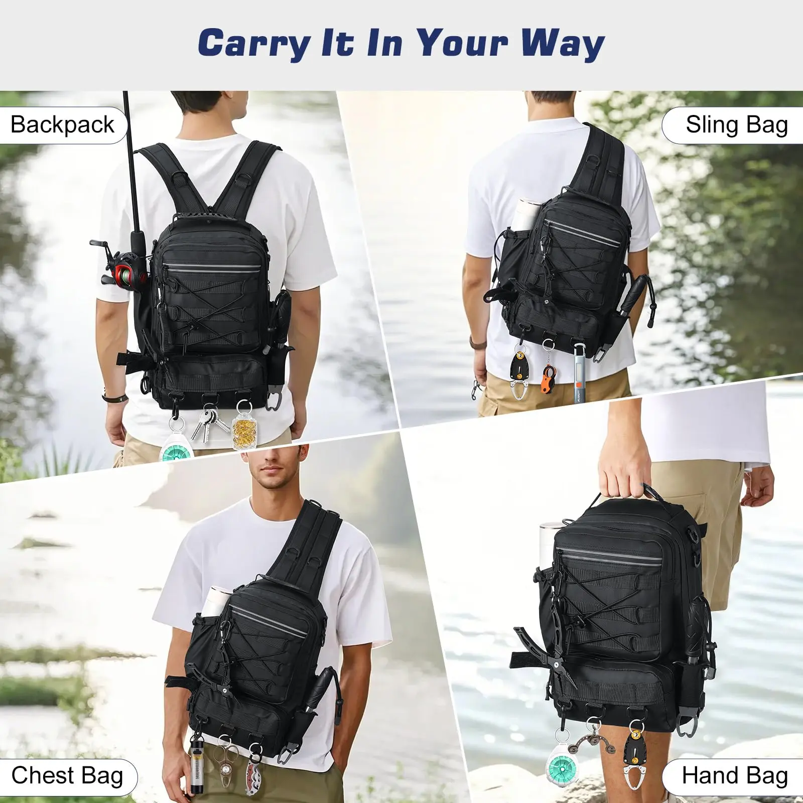 Multi-functional Shoulder Strap-You can zipper up the middle of the two shoulder straps to turn it into a shoulder bag or chest bag. You can also store it to use it as a handheld fishing bag.
