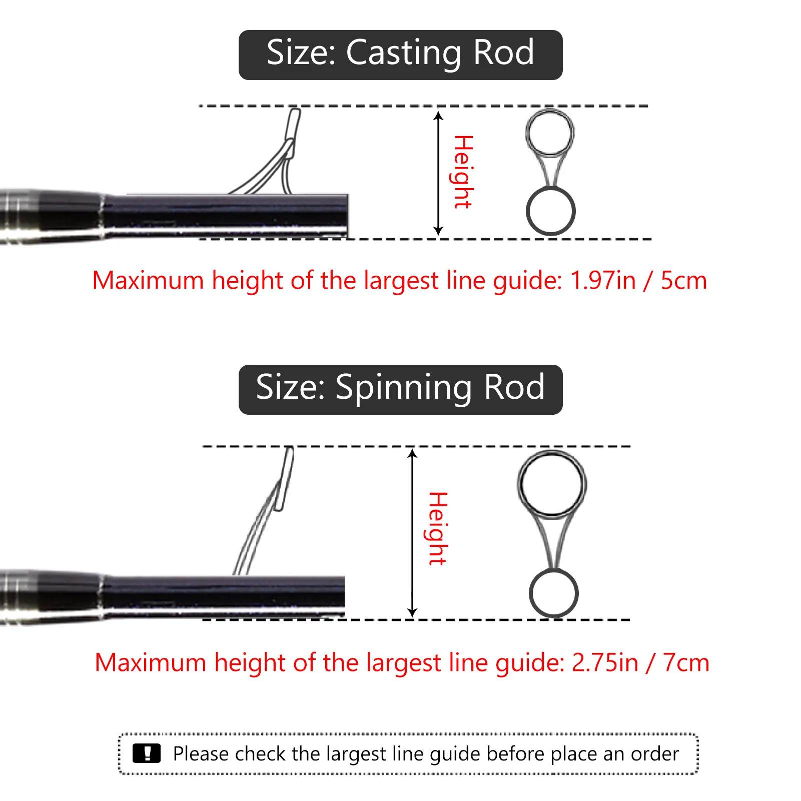 Sizes for casting or spinning rod are both available; In order to fit the larger line guides of spinning rods, sleeves made for spinning rods are wider in diameter