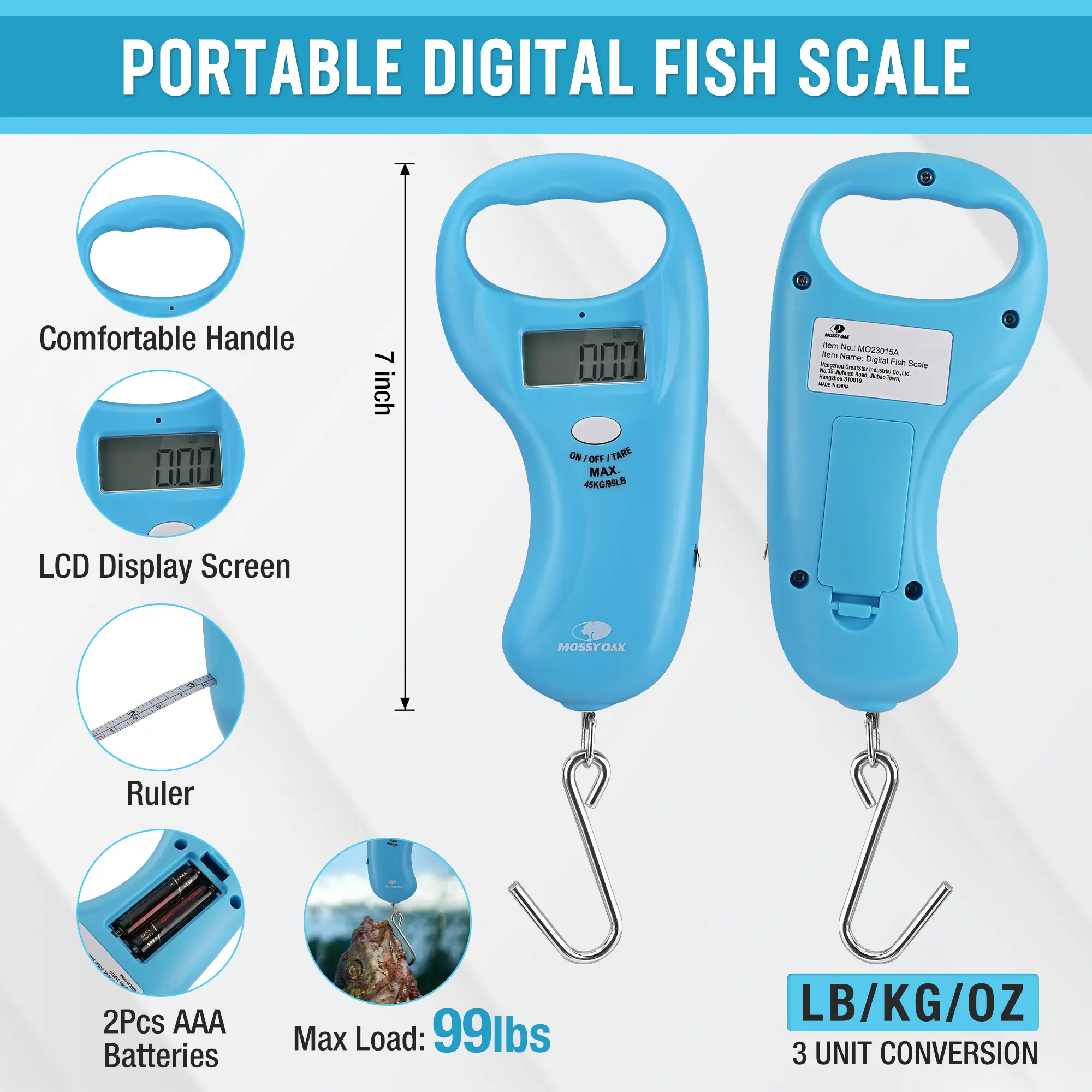·Digital Fishing Scale - A digital fishing gear scale with a comfortable anti-slip handle (Max Capacity: 99LB/45KG), and an LCD screen displaying the weight (pounds, ounces, kilograms). It is portable and lightweight, making it simple to operate. Equipped with a robust built-in tape, it can measure CM/FT objects within a length of 1m/3 ft. Powered by 2 x AAA battery, included in the package.