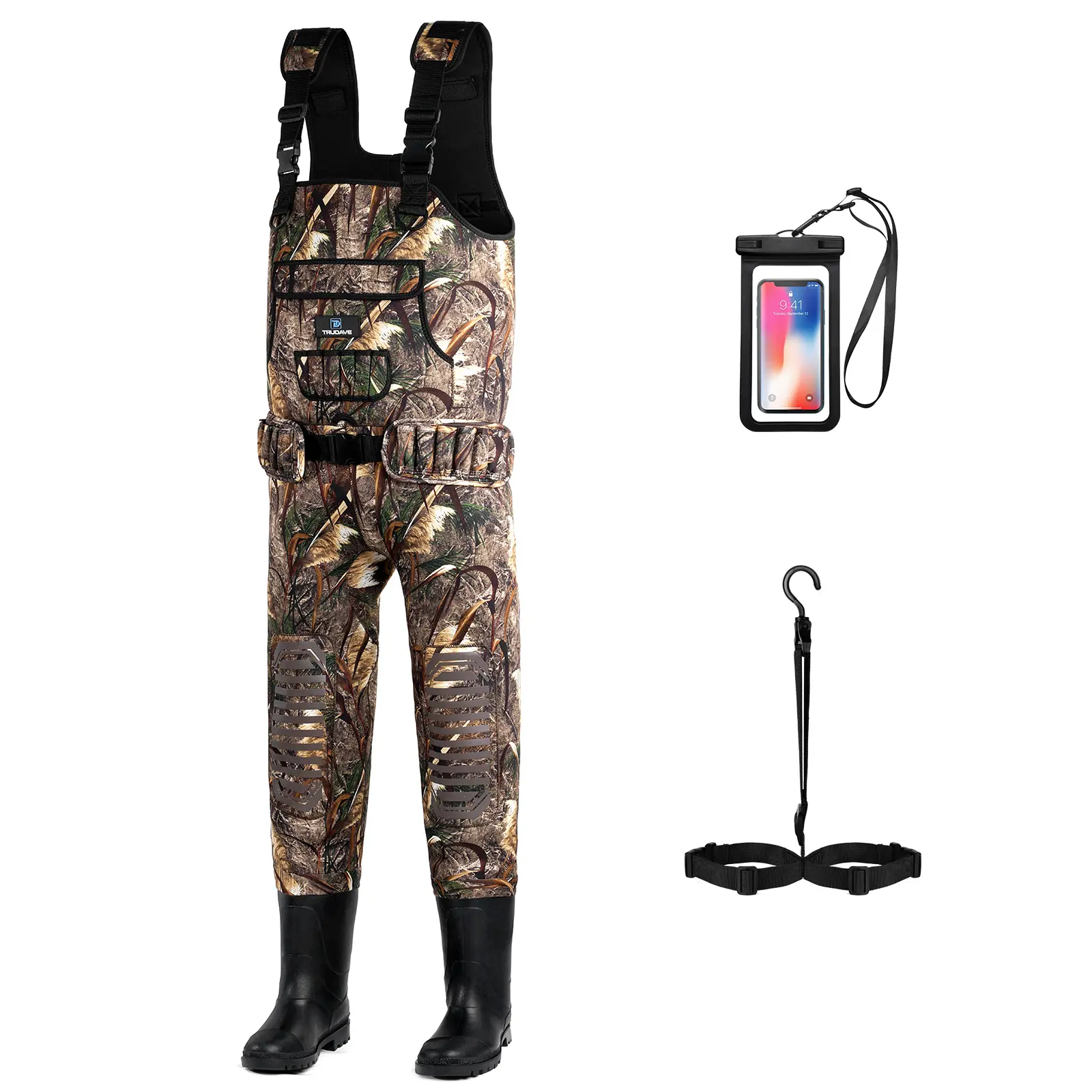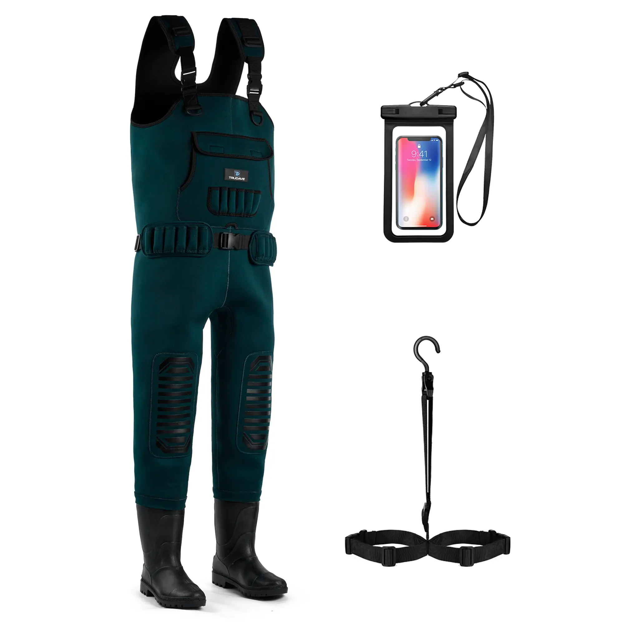 【Friendy Design】These fishing waders feature adjustable neoprene suspenders with quick-release buckles for easy on and off, a handwarmer pocket, and a waterproof phone pocket.
