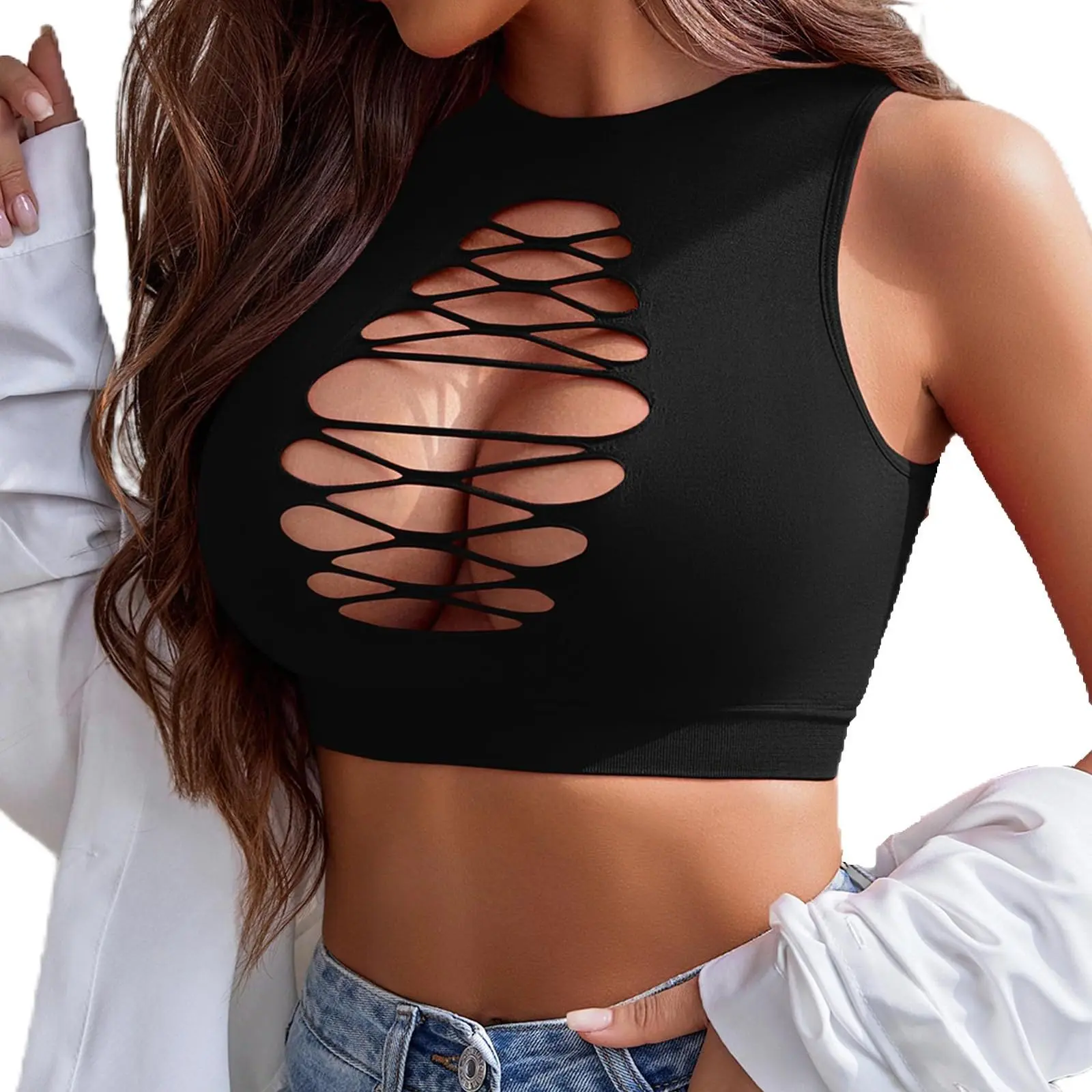 ·Design: Avidlove stunning fishnet top festures front cut out and corset detailing to accentuate your curves. The cute crop top is also sleeveless and has a crew neckline for a chic and fashionable look.