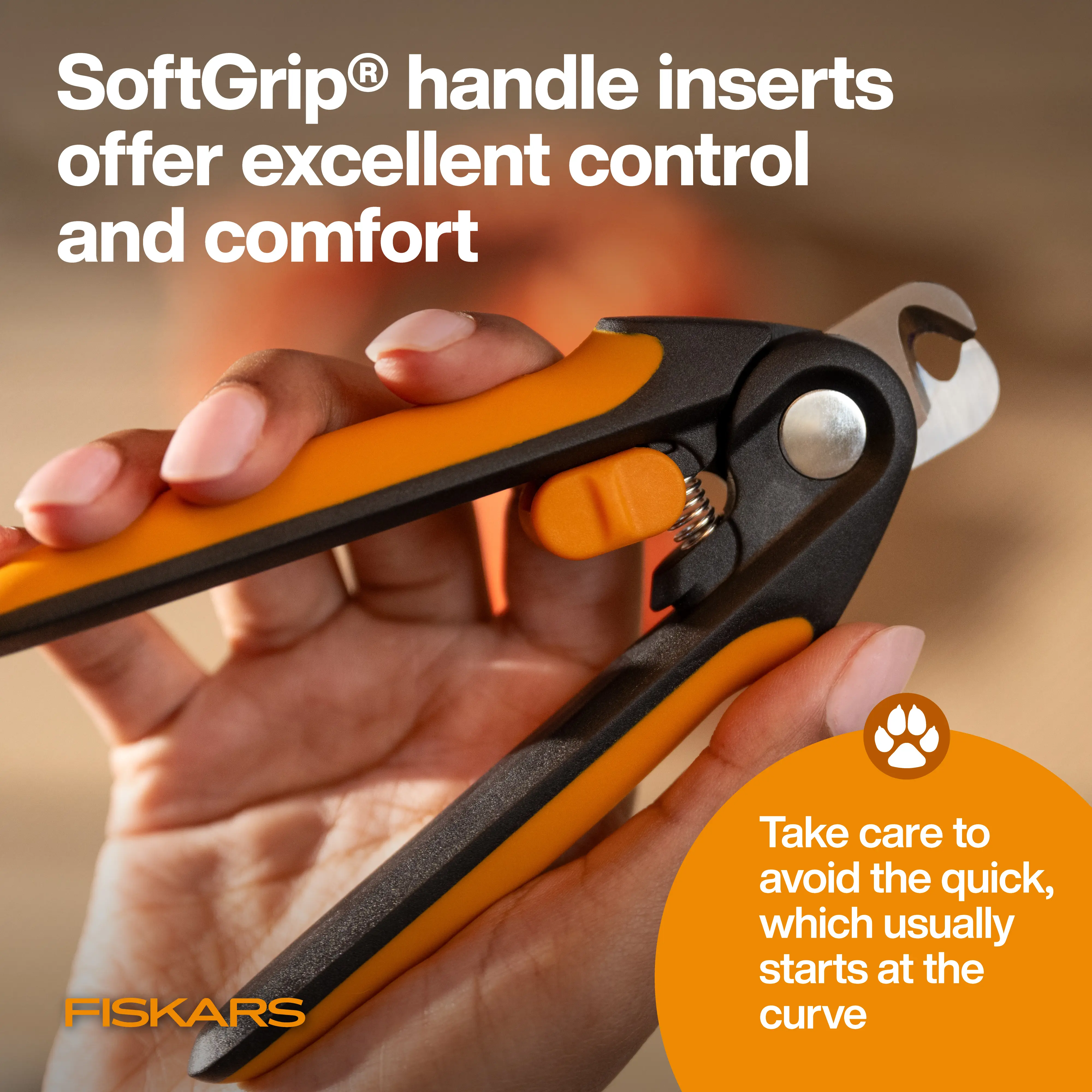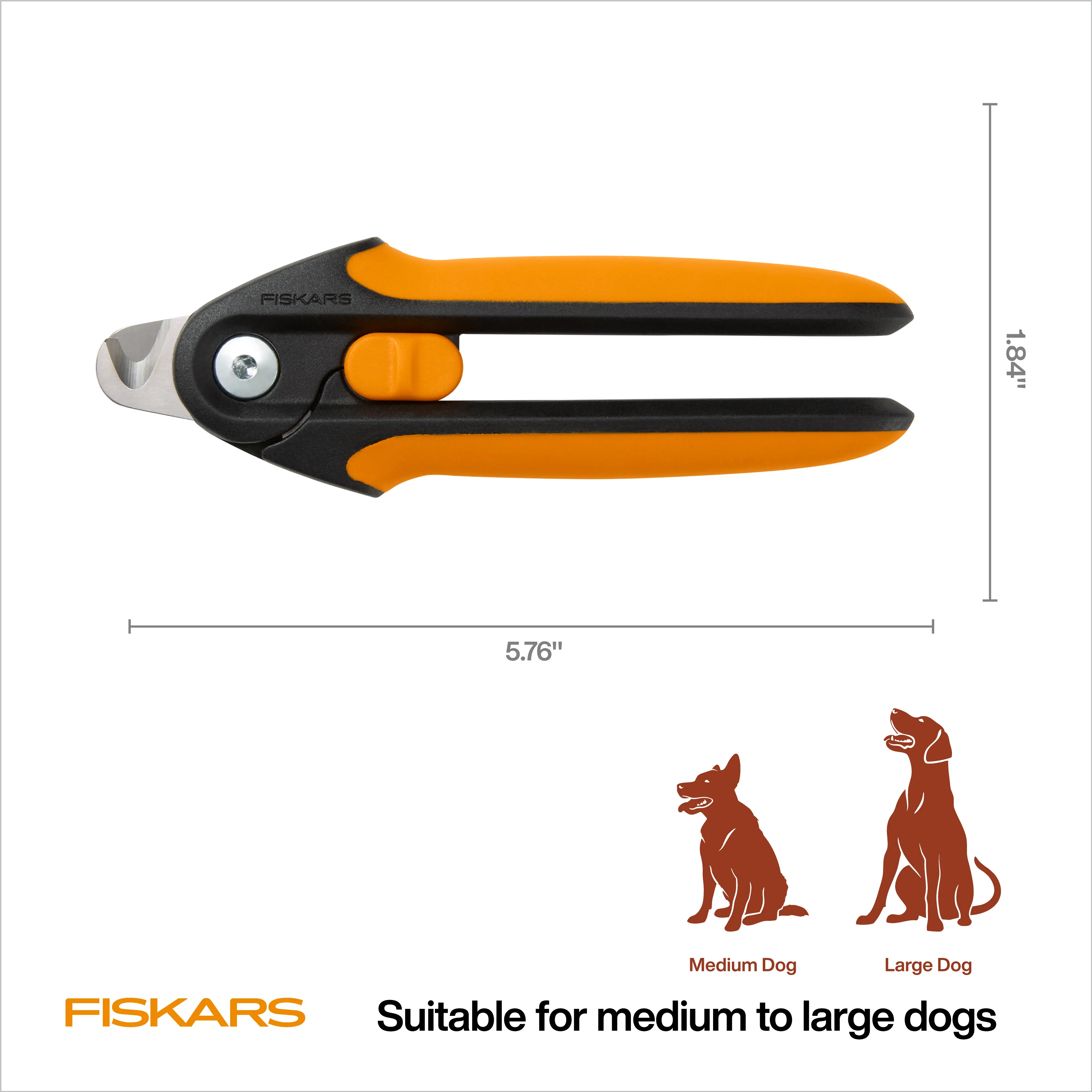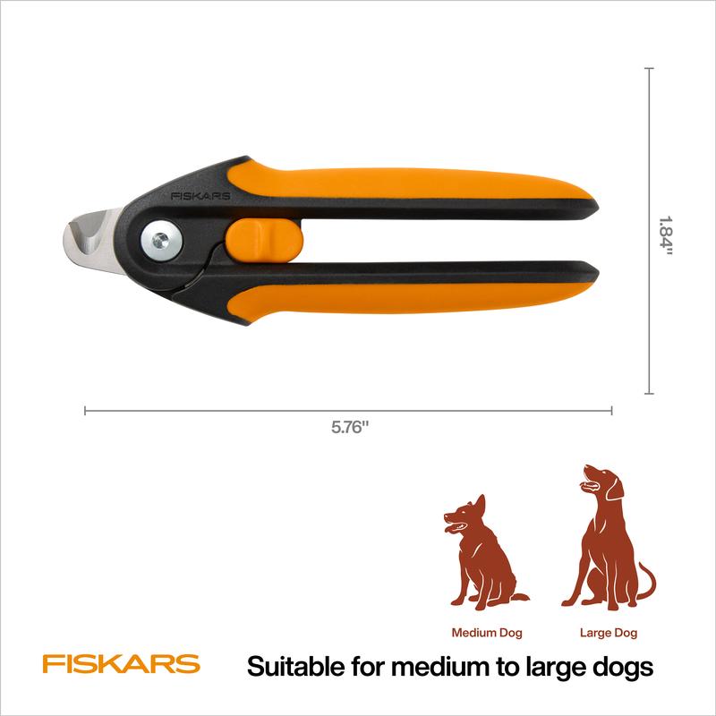 Make trimming your larger pet's nails a less stressful experience. Fiskars Nail Clippers bring the Fiskars reputation for cutting precision and excellence earned in scissors to pet care. The semi-circular blade is designed to provide a clearer view while cutting, helping to reduce the risk of cutting the quick, and the durable precision-ground stainless steel blades ensure a clean, efficient trim. The spring-action design gently opens the blades after each cut, and the comfortable SoftGrip handle with a safety lock offers confident and secure control. Because every pet deserves Fiskars.
