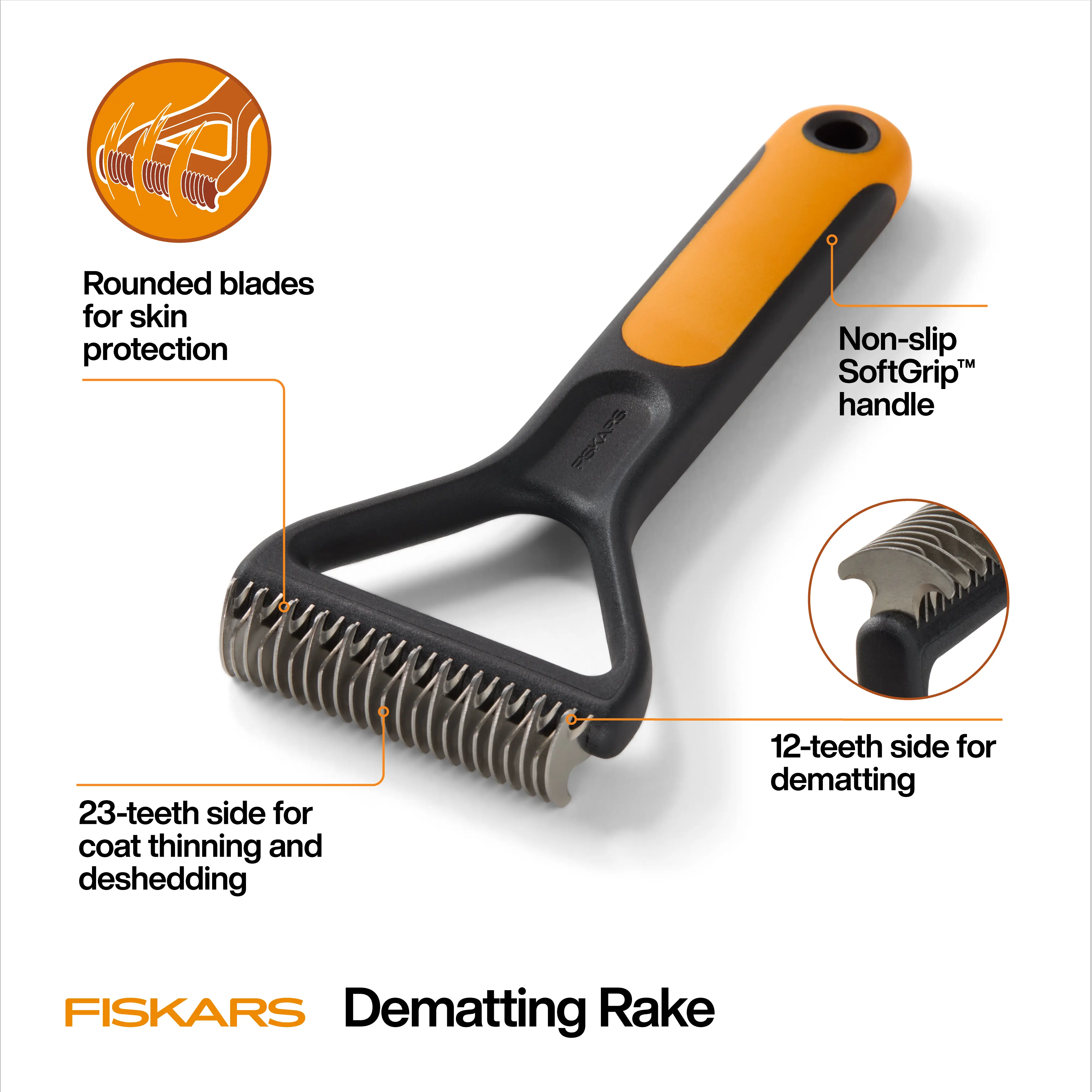 Remove mats and loose fur gently and effectively with the Fiskars Dematting Rake. As a trusted name in quality tools, Fiskars brings thoughtful design to pet care with this tool designed to make grooming a more comfortable experience for your pet. The 2-sided design features wide-spaced teeth on one side to detangle larger matts, plus narrow-spaced teeth on the other for thinning and removing loose undercoat fur. The comfortable SoftGrip handle provides a secure hold for controlled grooming. Because every pet deserves Fiskars.