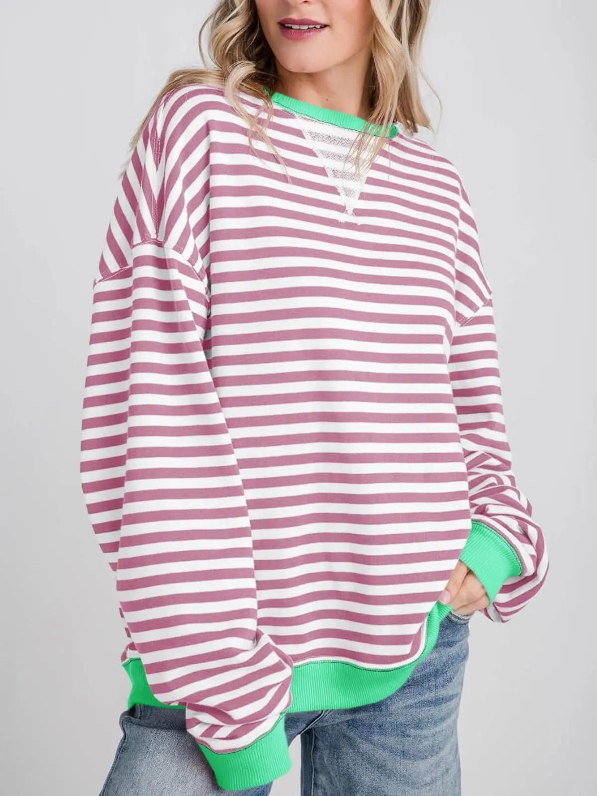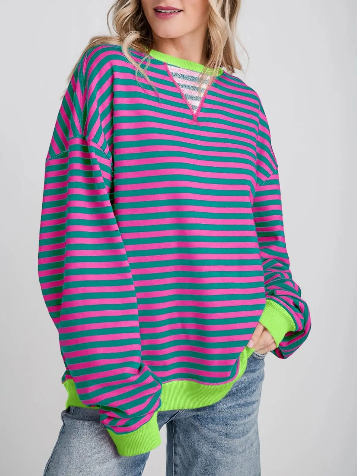 ✨ Our women's oversized sweatshirt is crafted from a cotton blend, ensuring softness, stretchability, and breathability. It's perfect for spring, summer, and autumn. The ribbed neck, cuffs, and hem add a stylish touch. The unique stripe and color block design bring a fun, youthful vibe. Ideal for Y2K fashion enthusiasts. 🌈
