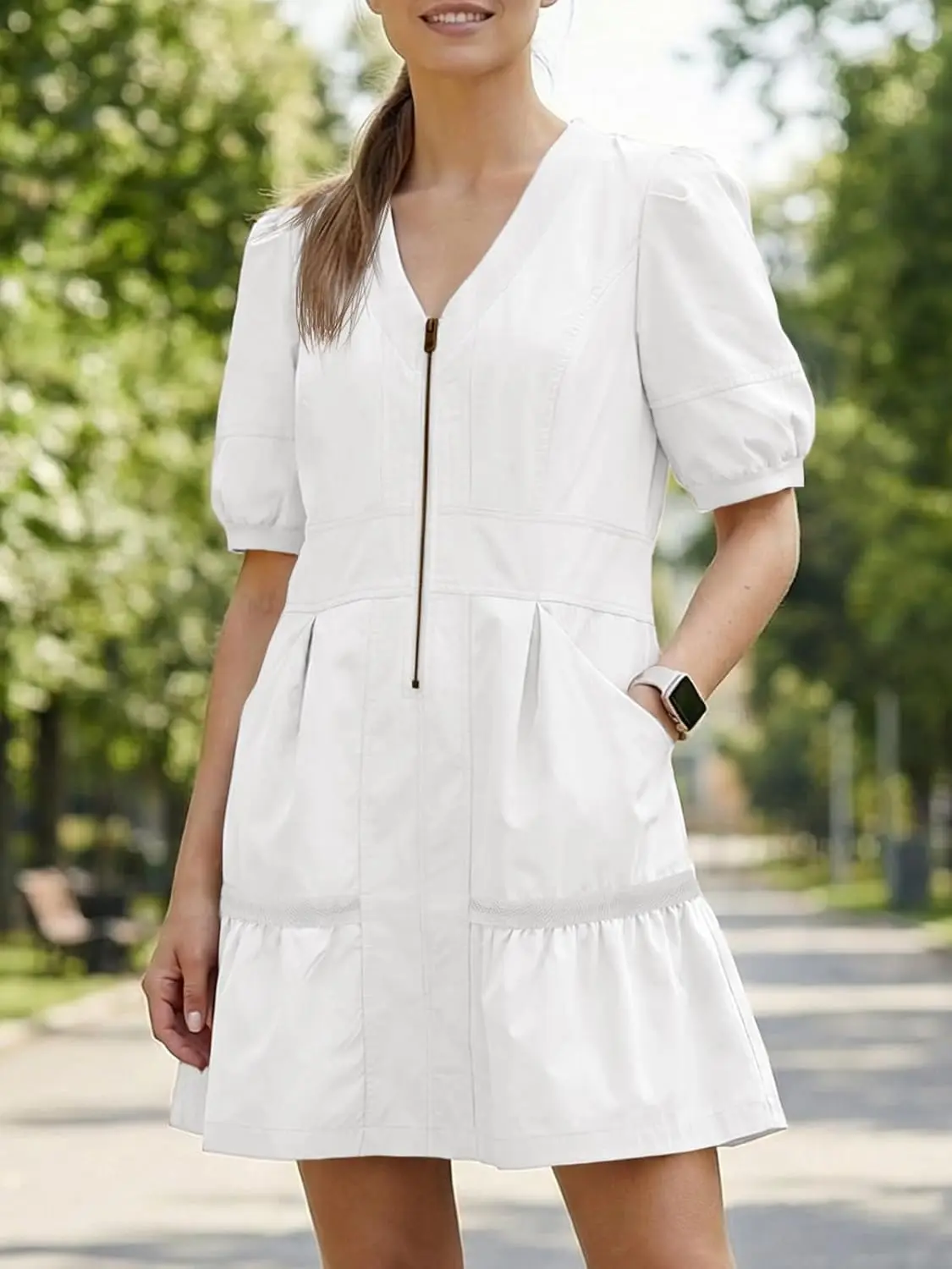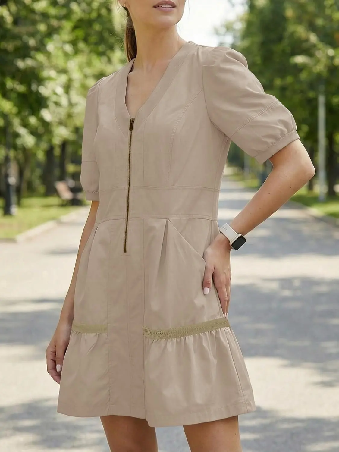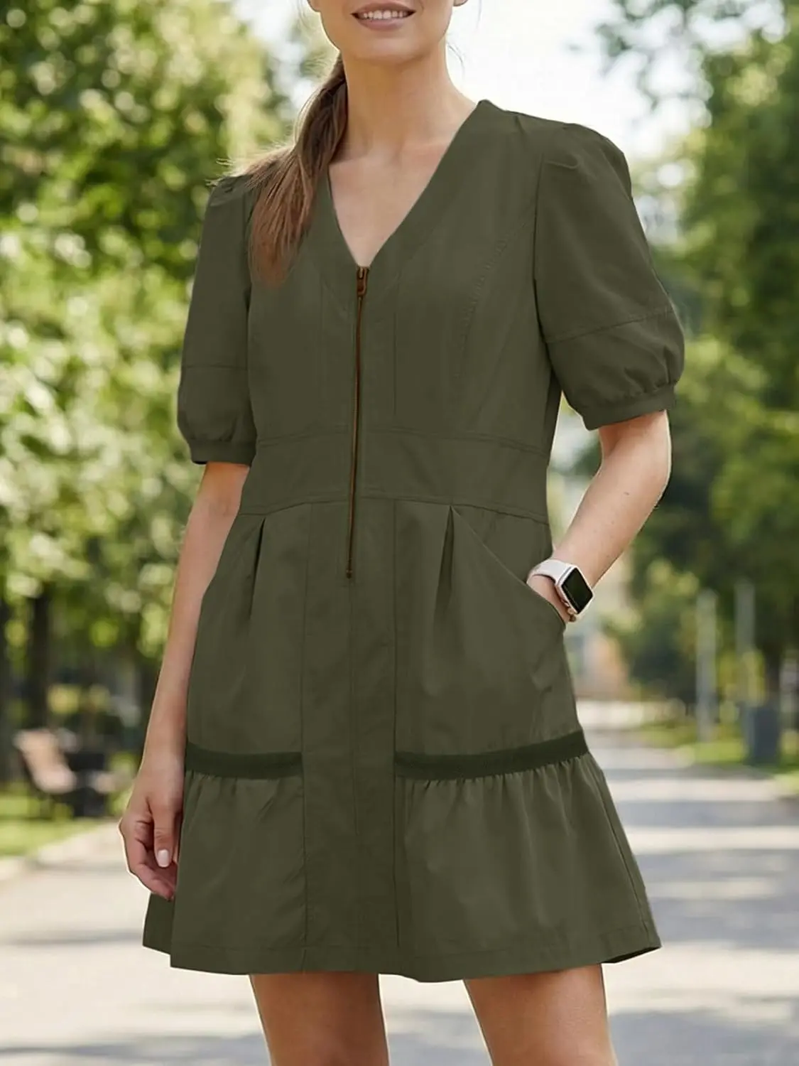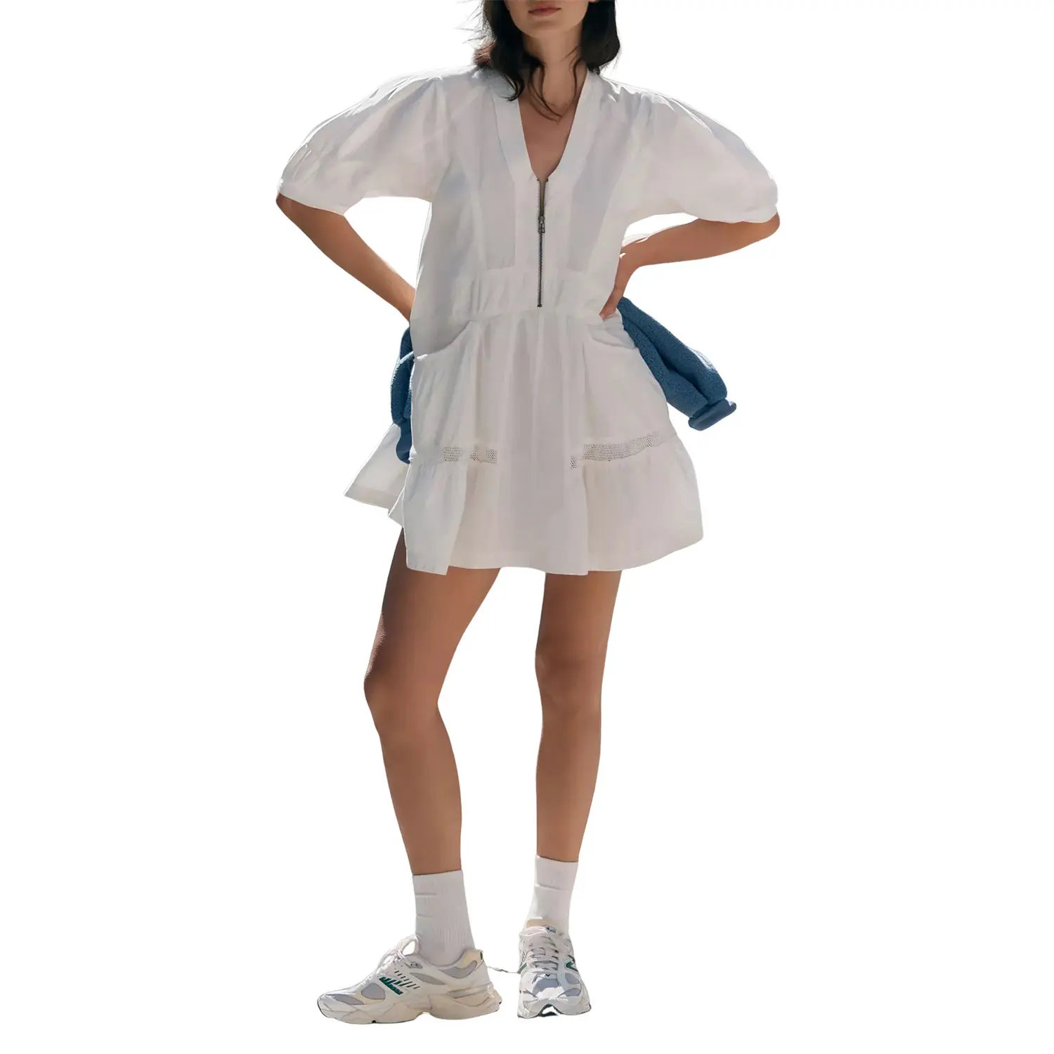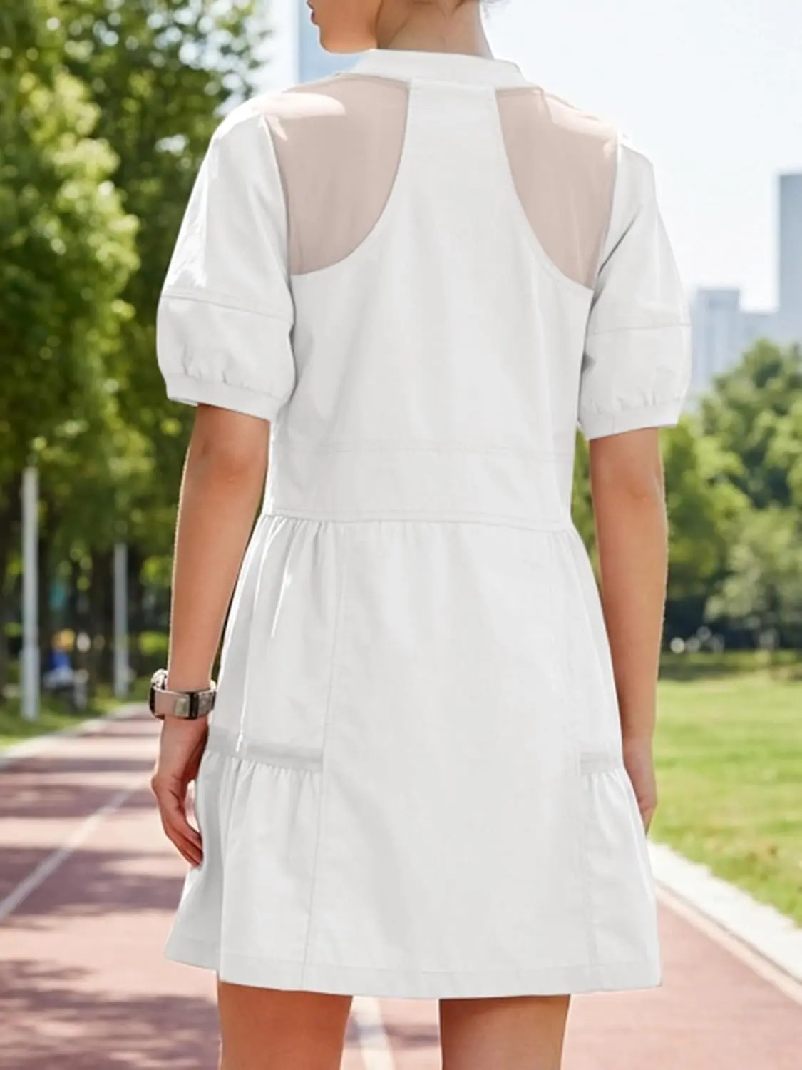 This mini dress features a lightweight 135g polyester T400 plain weave main fabric, paired with breathable 60g polyester mesh for cutout details. The trim uses a soft 280g combed cotton elastic rib for a comfortable fit. It comes in vibrant colors, including coral, black, blue, and army green. 🌈