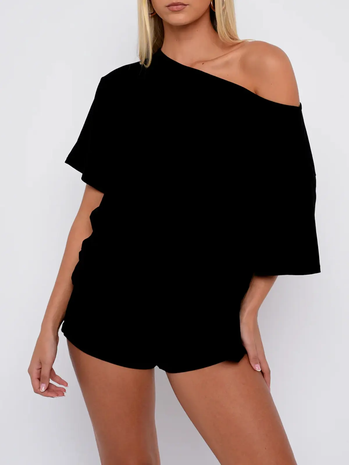 Loose-fit short sleeve top pairs effortlessly with stretchy fitted shorts for a balanced and flattering silhouette.