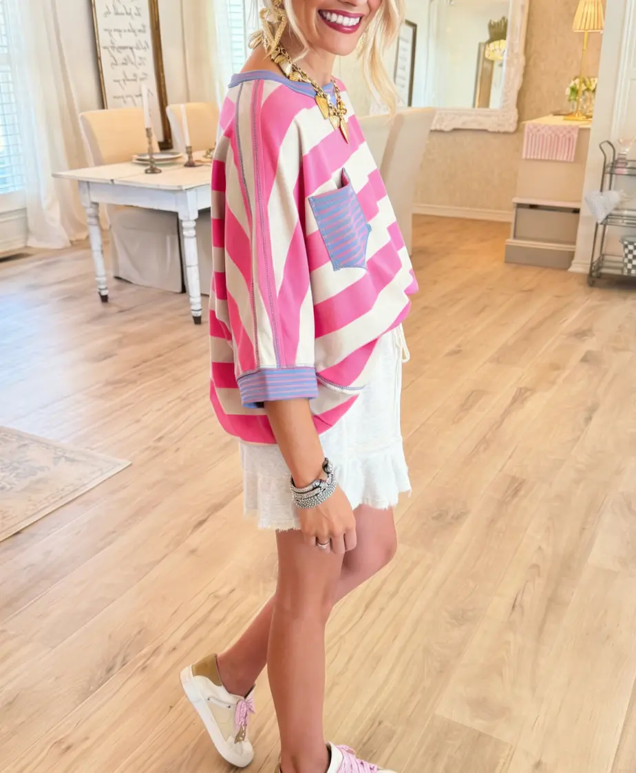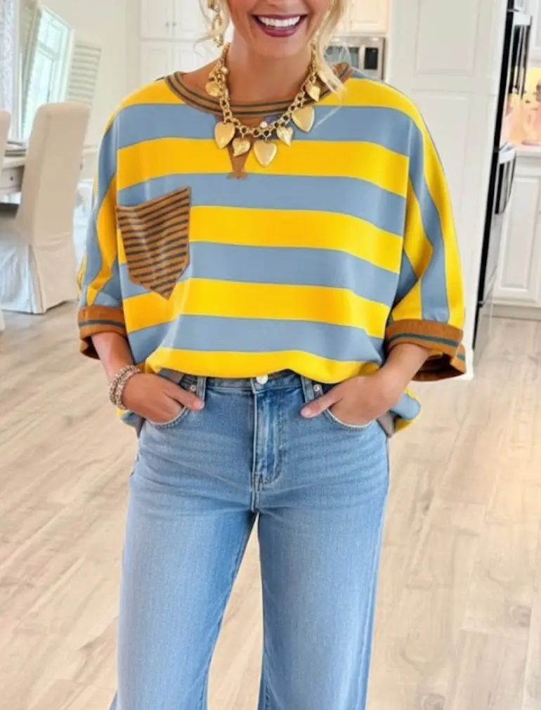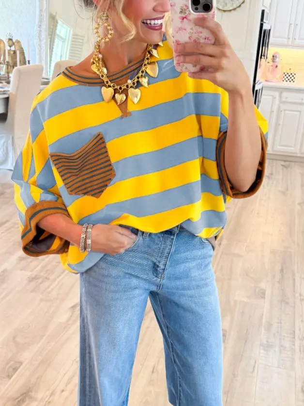 🎨 Design & Patterns 🎨 - Features bold, eye-catching horizontal stripe patterns in four vibrant colorways: Pink & White, Brown & White, Yellow & Blue, and Black & White. - Each shirt is accented with a contrasting color-blocked patch pocket and cuffs, adding rich texture and visual interest.