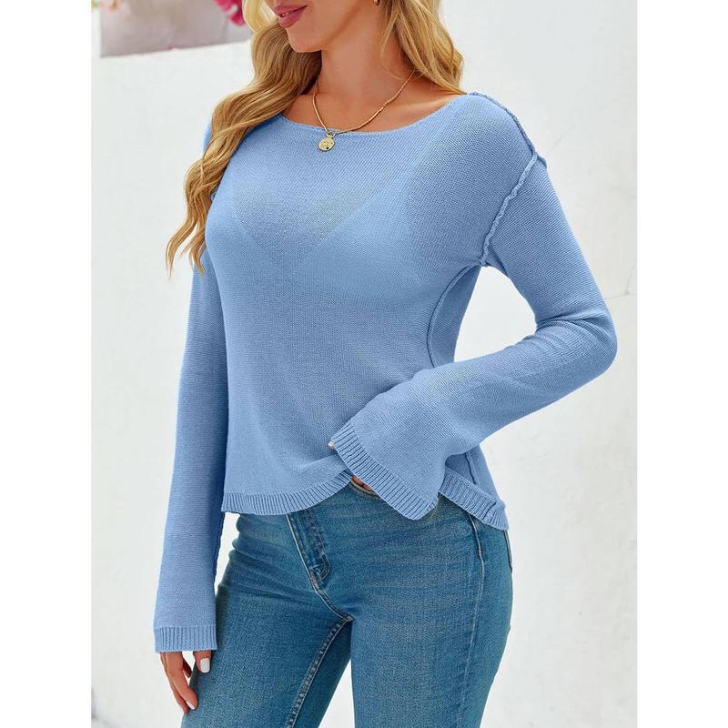 Women See Through Shirt Boat Neck Long Sleeve Knit Casual Blouse Tops
