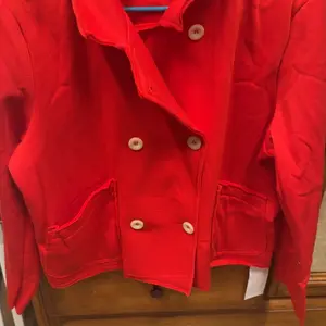 Two light-brown buttons at the front offer a warm, earthy contrast to the vibrant red. These buttons are not only functional but also enhance the aesthetic appeal of the blazer. They add a subtle touch of style, making the jacket more than just clothing.