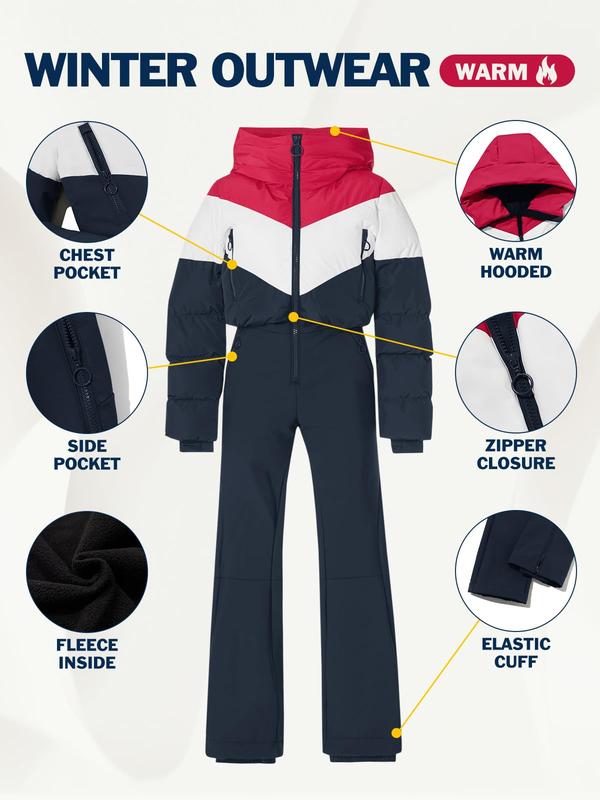 ·CHIC DESIGNS: This innovative snowsuit with color block pattern, adding a pop of vibrancy to snowy landscapes. The waterproof exterior repels moisture, ensuring you stay dry throughout your skiing adventures. Zippered vents at strategic locations promote air circulation, preventing overheating during high-energy activities