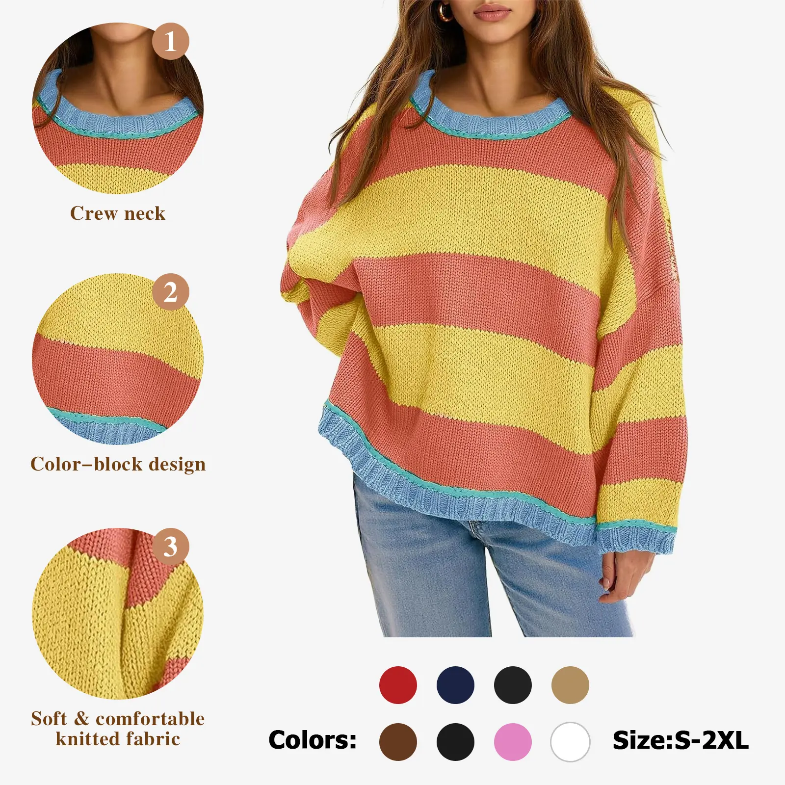 Details - Round Neck Design: Simple and generous, easy to match with various clothing. - Color Block Element: Adds fun and vitality to the overall shape.