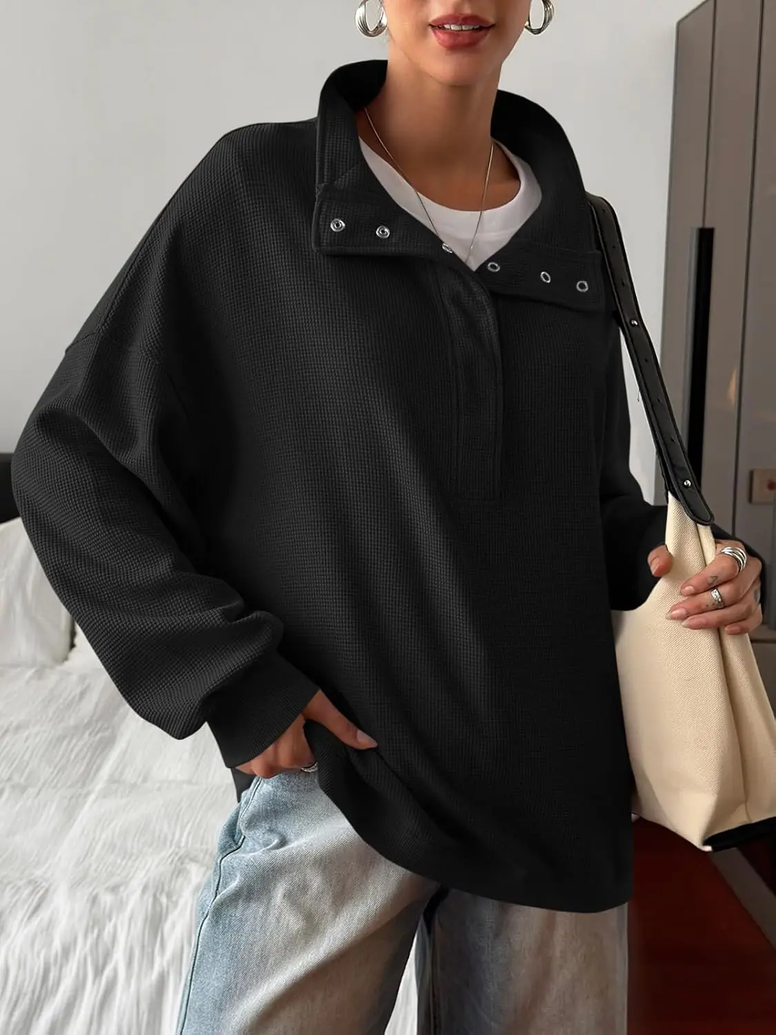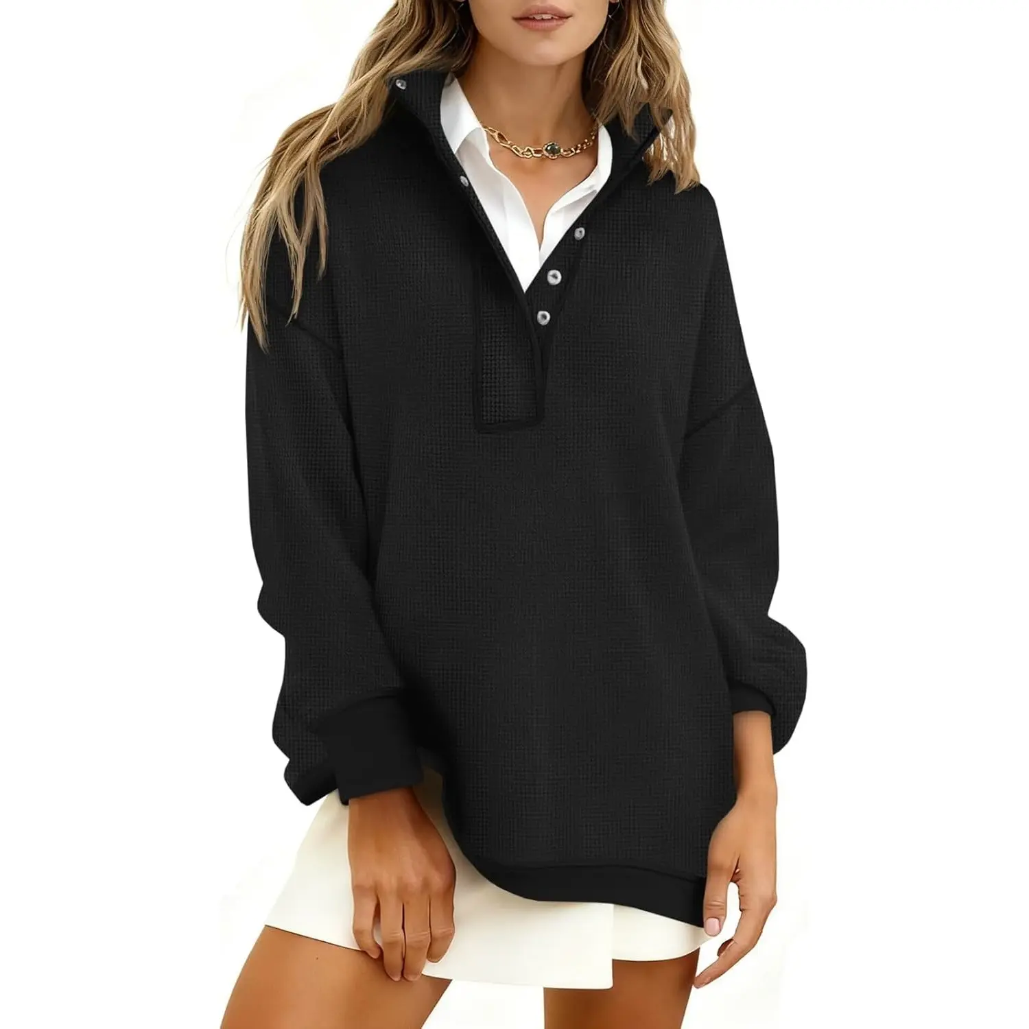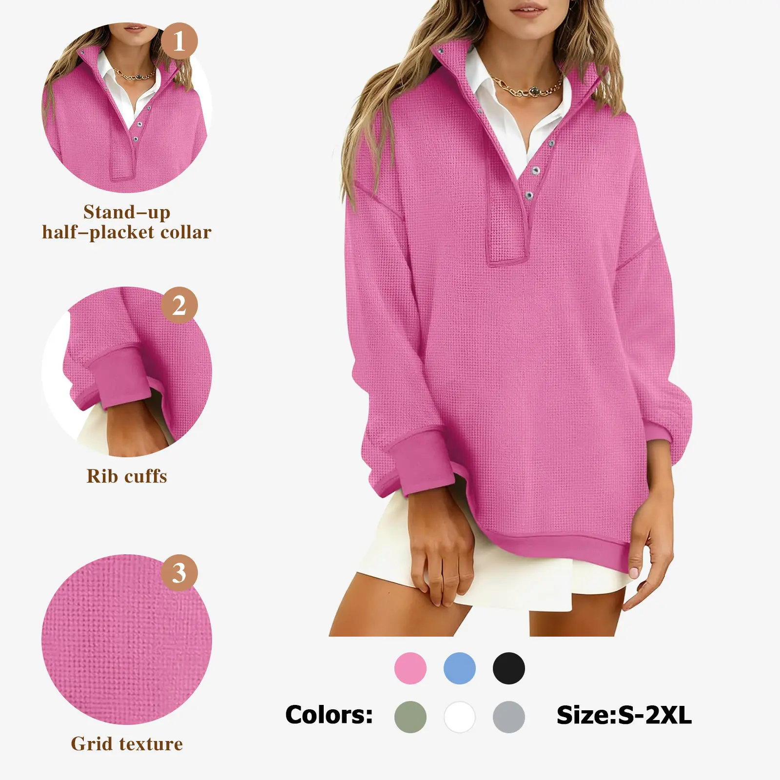 ·The sweatshirt features a stylish button henley neck, offering a customizable look. The oversized silhouette and long sleeves provide a relaxed, comfortable fit. This pullover top is a versatile piece, blending casual comfort with a classic detail.