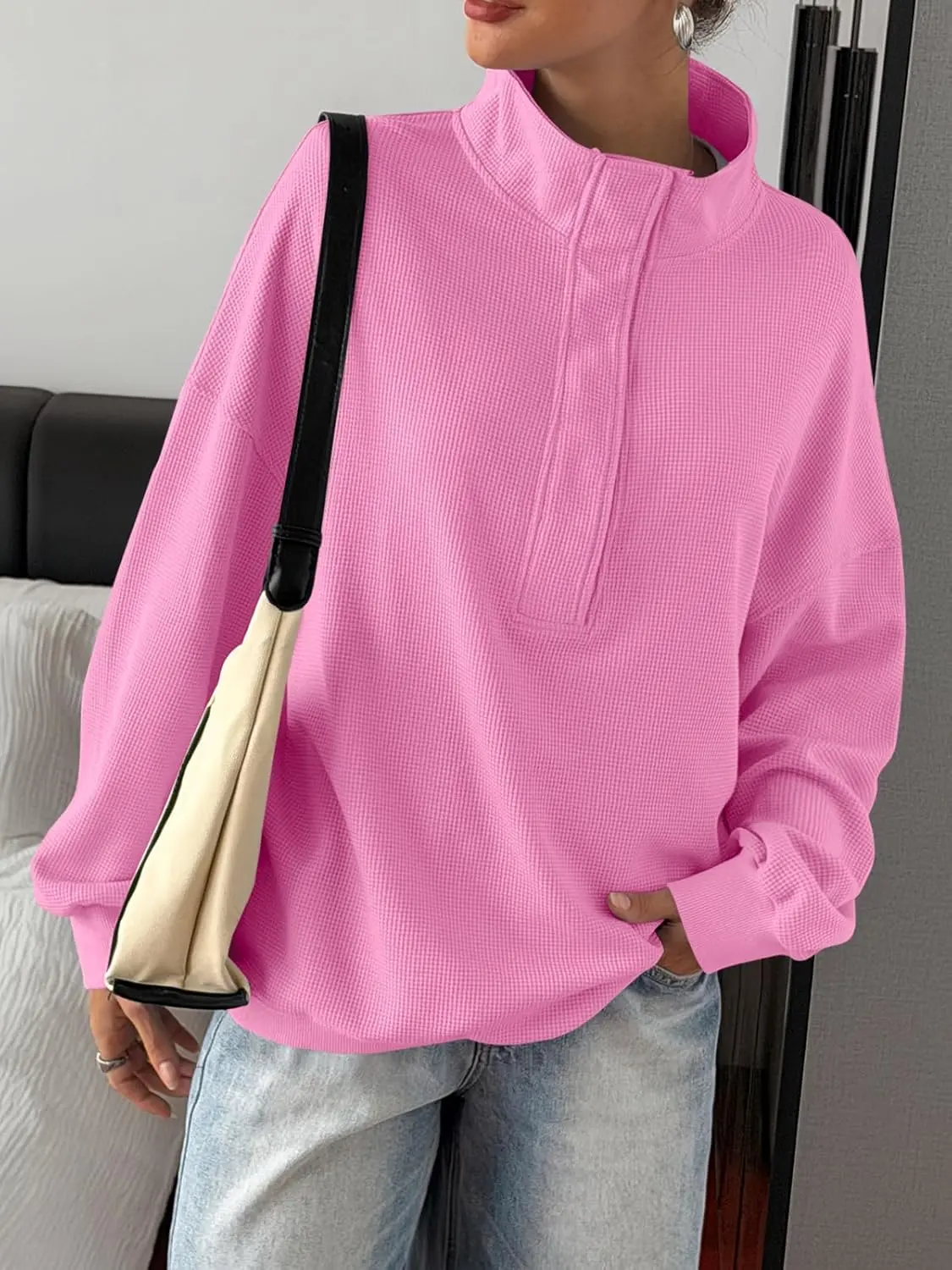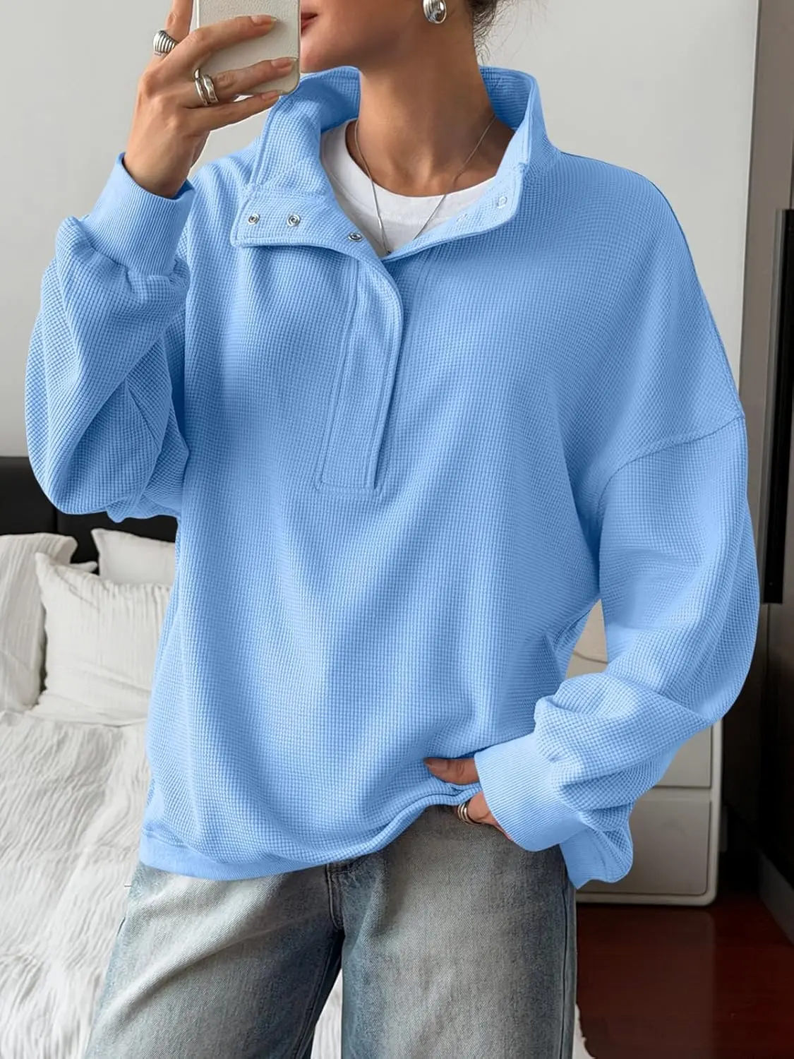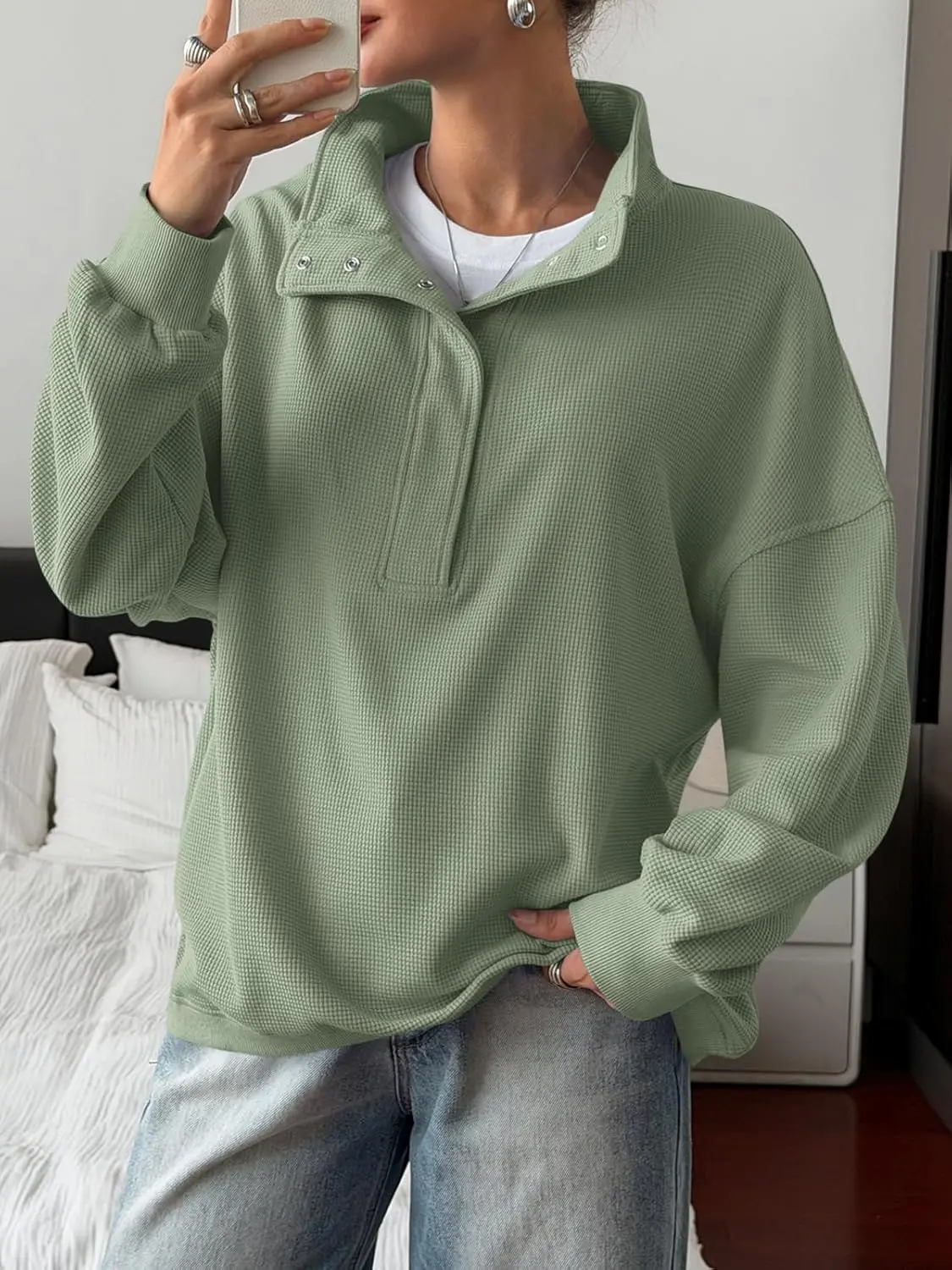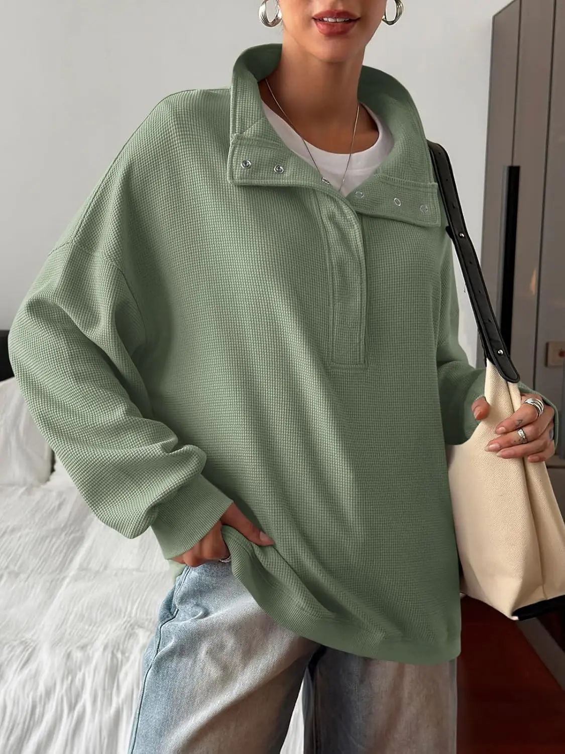 ·The sweatshirt features a stylish button henley neck, offering a customizable look. The oversized silhouette and long sleeves provide a relaxed, comfortable fit. This pullover top is a versatile piece, blending casual comfort with a classic detail.