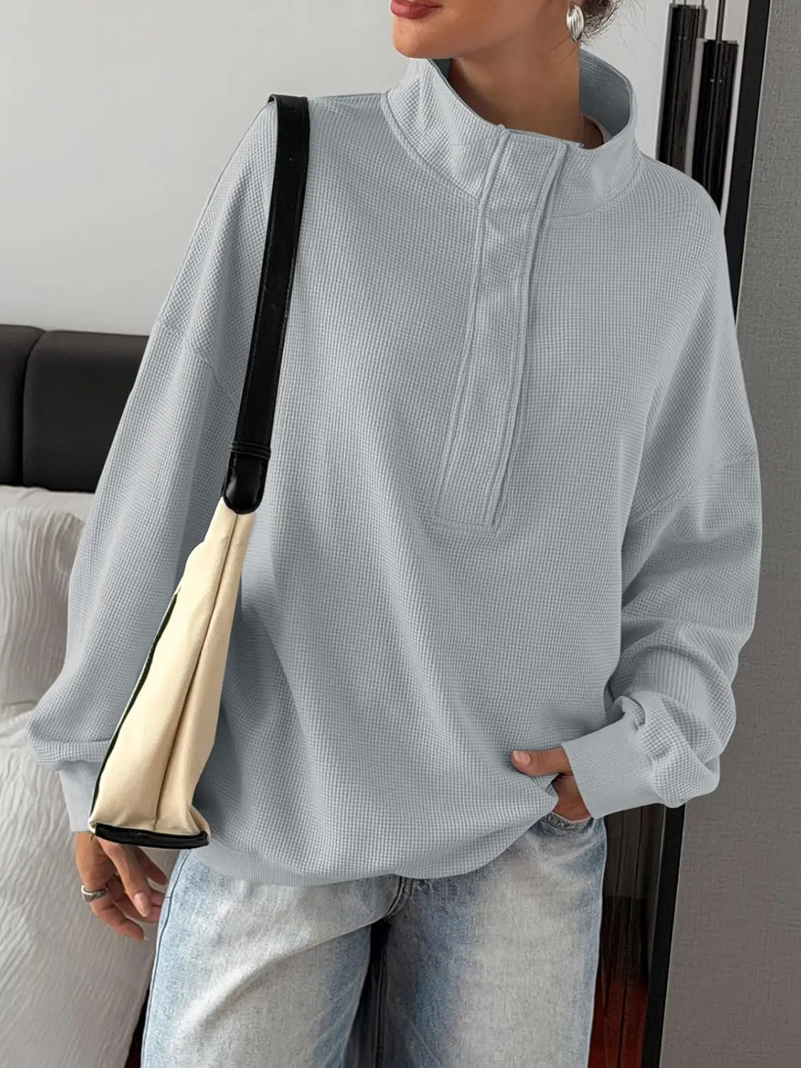 ·This oversized sweatshirt is made from soft, waffle knit fabric. 🧶 The unique texture not only looks stylish but also provides excellent insulation and breathability. This material ensures both comfort and style in one piece.