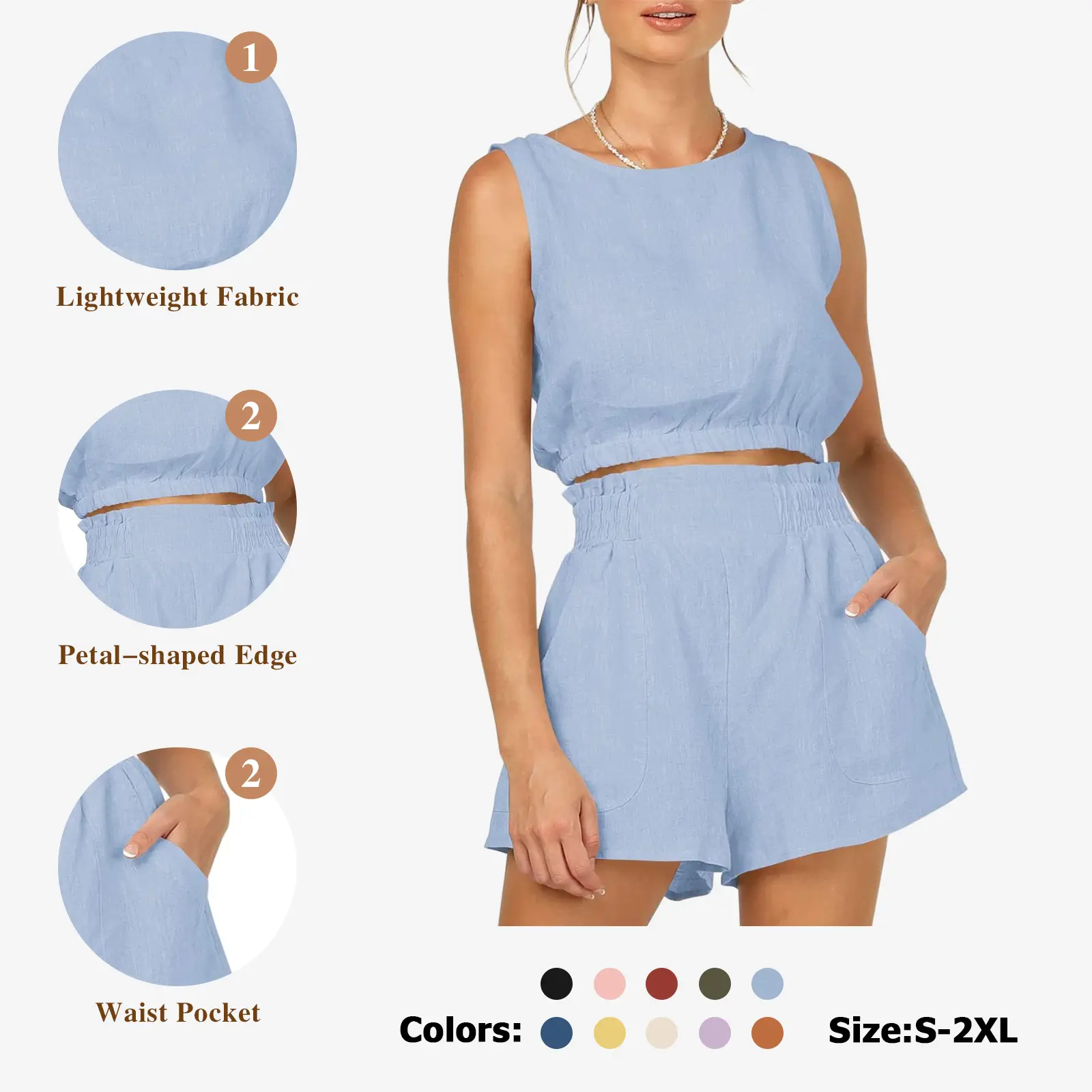 Features: Solid color, relaxed fit, sleeveless, halterneck, back tie, high waist, elastic hem and waistband, side pockets, cropped vest shirts and shorts pants, simple casual two piece clothing sets