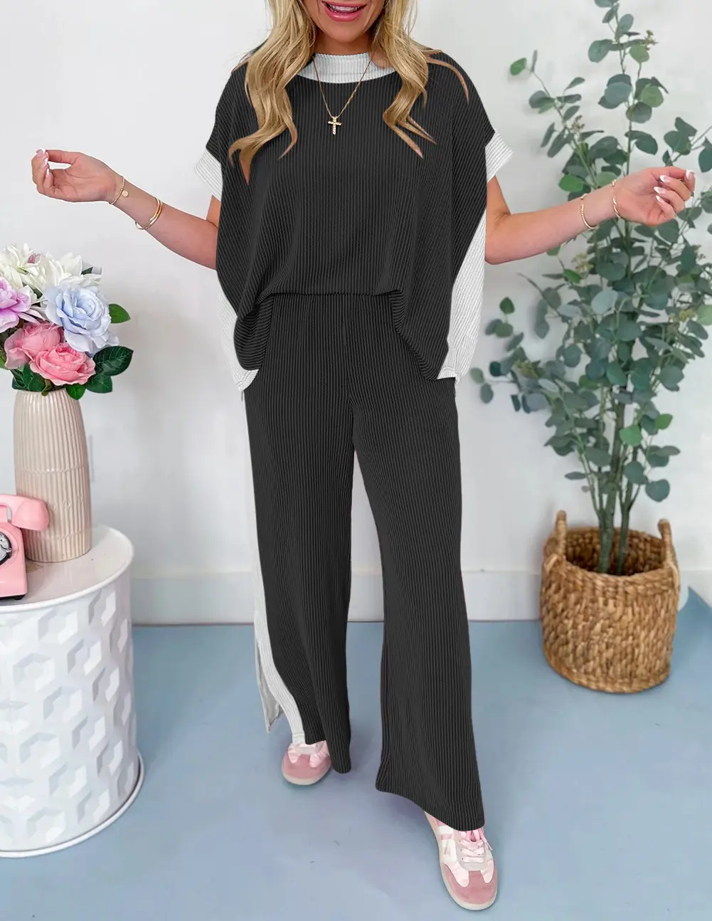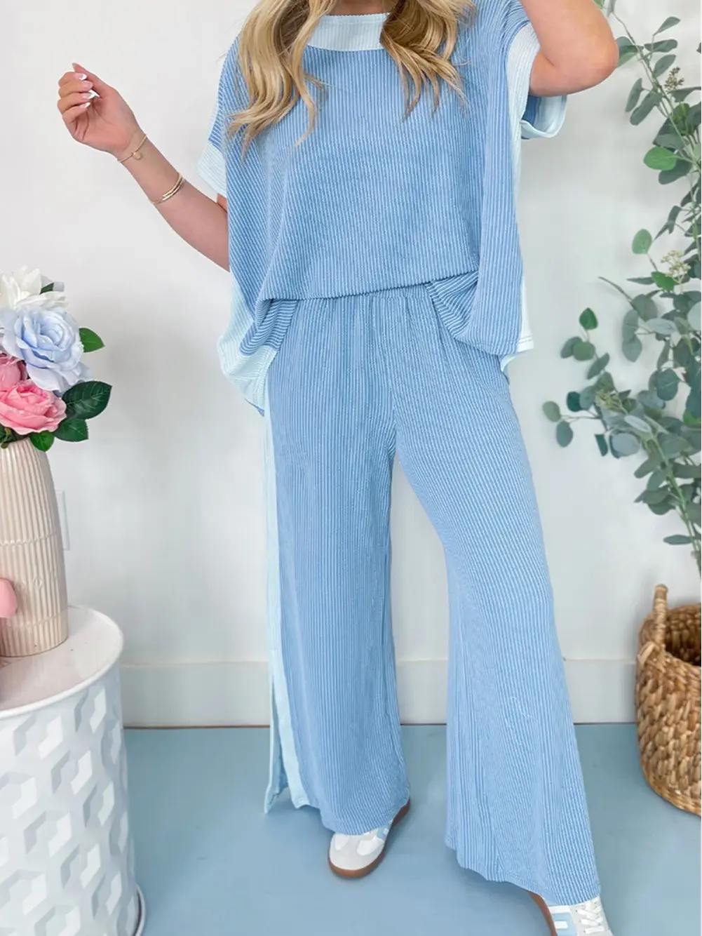 Wide leg pants come with a comfortable elastic waistband and practical side pockets. Chic side slits at the hem create a flattering silhouette and allow easy movement. This two-piece set is great for casual wear, travel, or lounging.