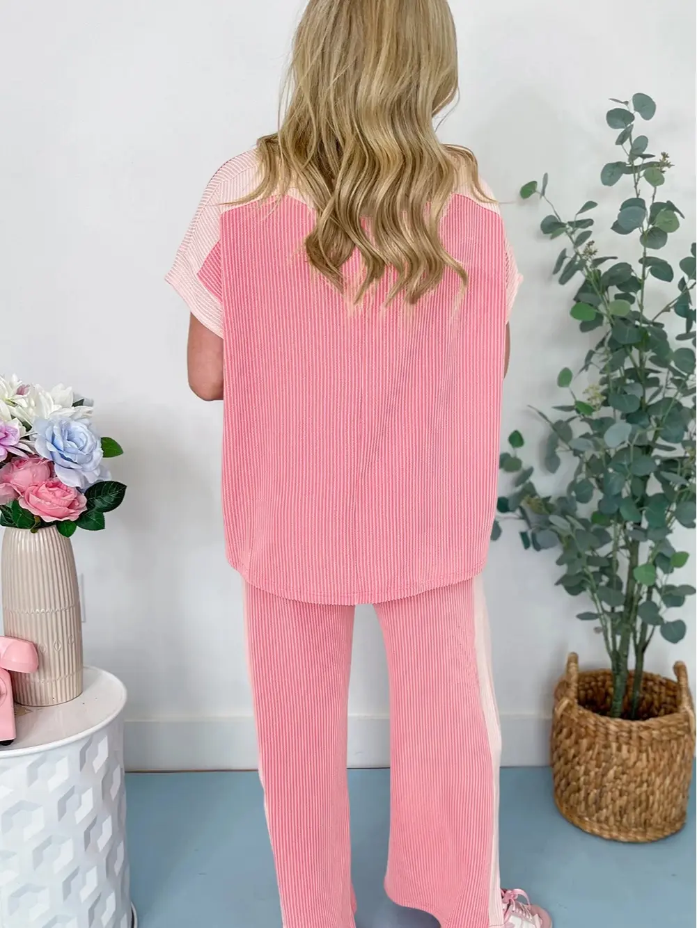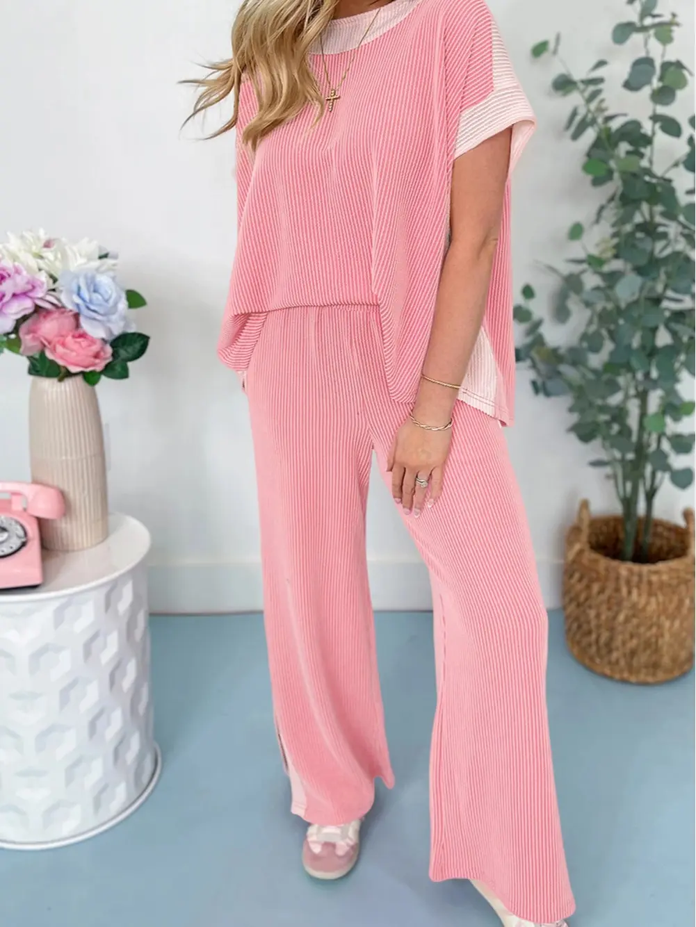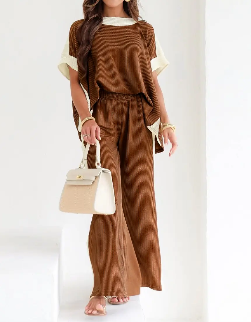 Modern color contrast adds a trendy touch, making this matching set stand out effortlessly for casual wear or lounging. The Fisoew Women’s Ribbed Two Piece Outfit combines a short sleeve top with wide leg pants, featuring pockets for convenience. Choose from pink, blue, brown, or black.