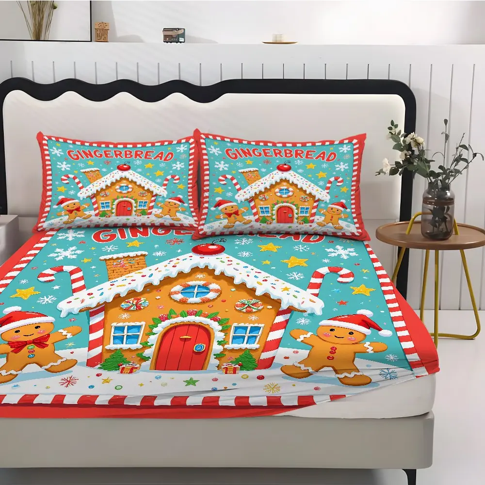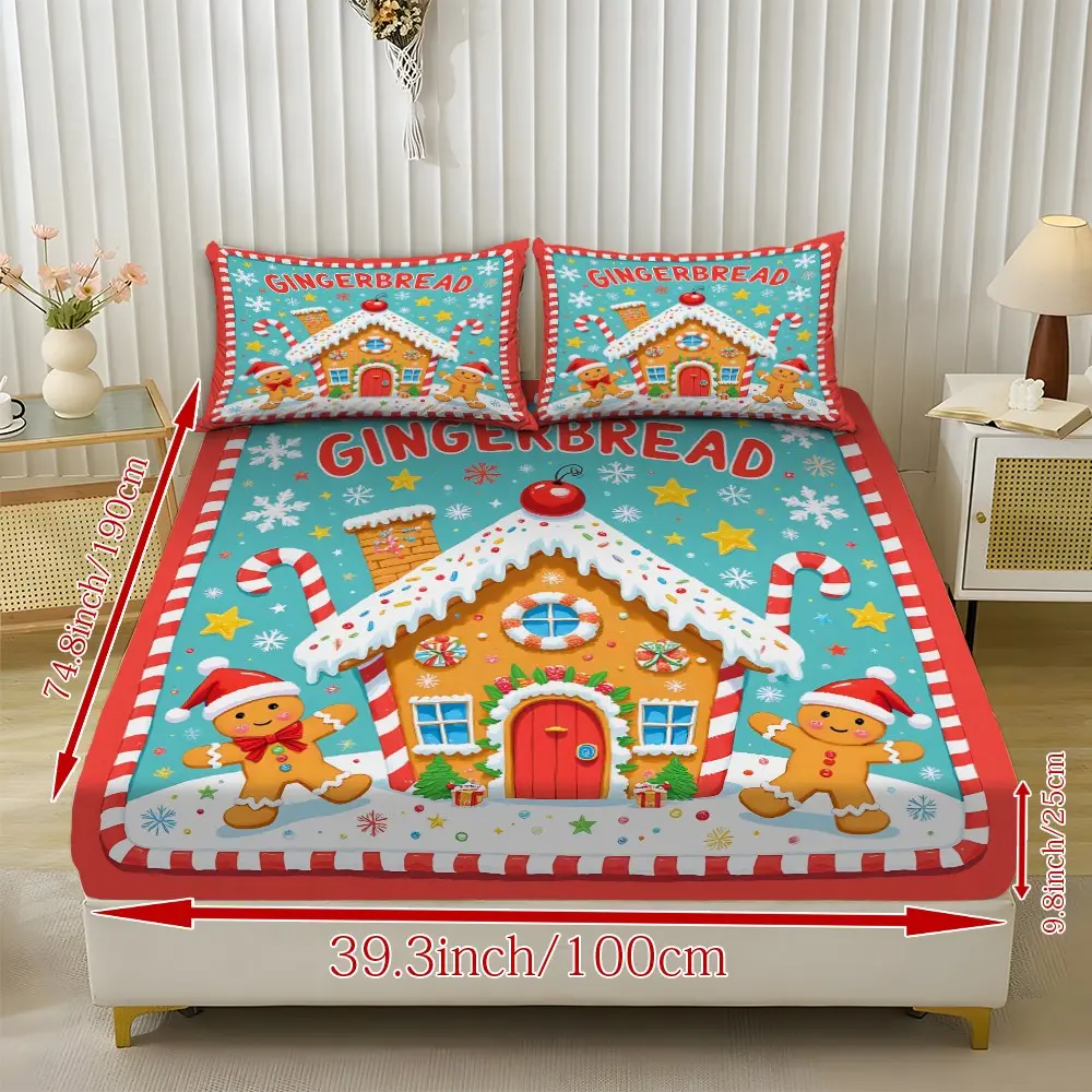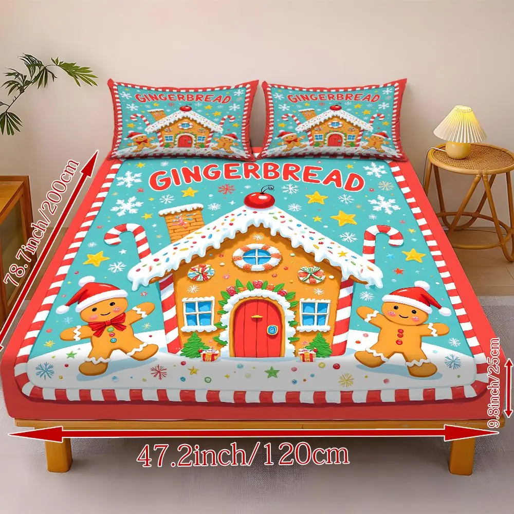 Fitted Sheet 3-Piece Set 2D Flat Gingerbread Man Pattern Mattress Cover (1 fitted sheet + 2 pillowcases, no insert), stylish, soft, and comfortable sheets, skin-friendly and breathable bedding, suitable for family bedrooms and guest rooms, all year round.