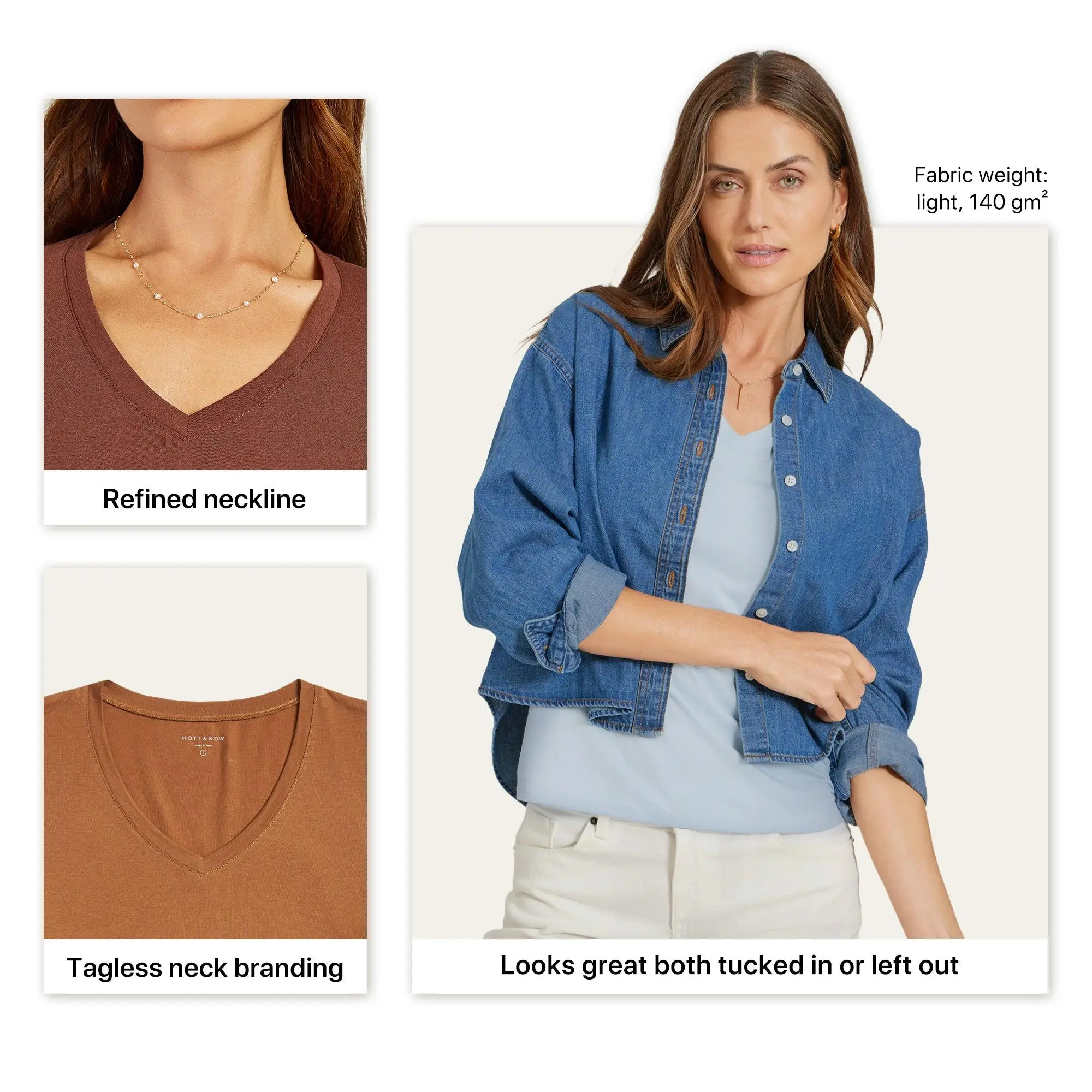 Key Features:It is our dressiest tee. It’s lightweight and fitted to skim your curves without clinging too tightly, making it the ideal layering tee for professional and casual settings alike.Design & Details:-Fabric Composition: 50% Pima cotton; 50% modal-Fabric weight: light; 140 gm²-Thoughtful Design: short-sleeve; the V-neck depth strikes the perfect balance between sensual and classy; tagless neck branding for itch-free wear-Match: It looks great under blazers, cardigans, or jackets.Wash and maintain:Buy once, wash countless times, and enjoy for seasons to come. It’s pre-washed and pre-shrunk, so it holds its shape and doesn’t thin or pill.