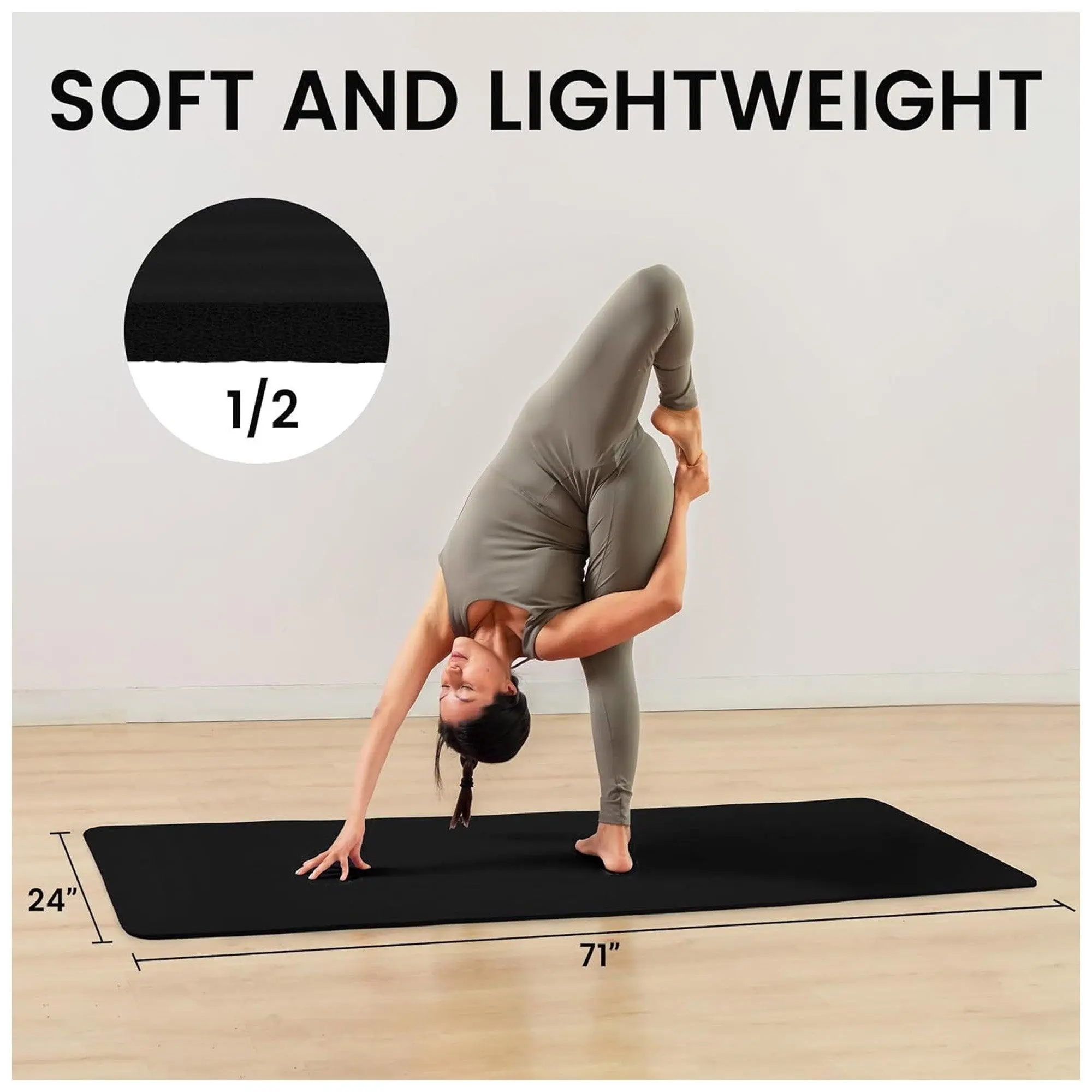 Measuring 71 inches long and 24 inches wide, this full-size yoga mat provides ample space for users of all shapes and sizes. Made from premium high-density foam, the 1/2-inch thick mat delivers exceptional support and comfort to cushion your spine, hips, knees, elbows, and other pressure points on hard flooring. Say goodbye to discomfort and hello to deeper, more focused sessions.