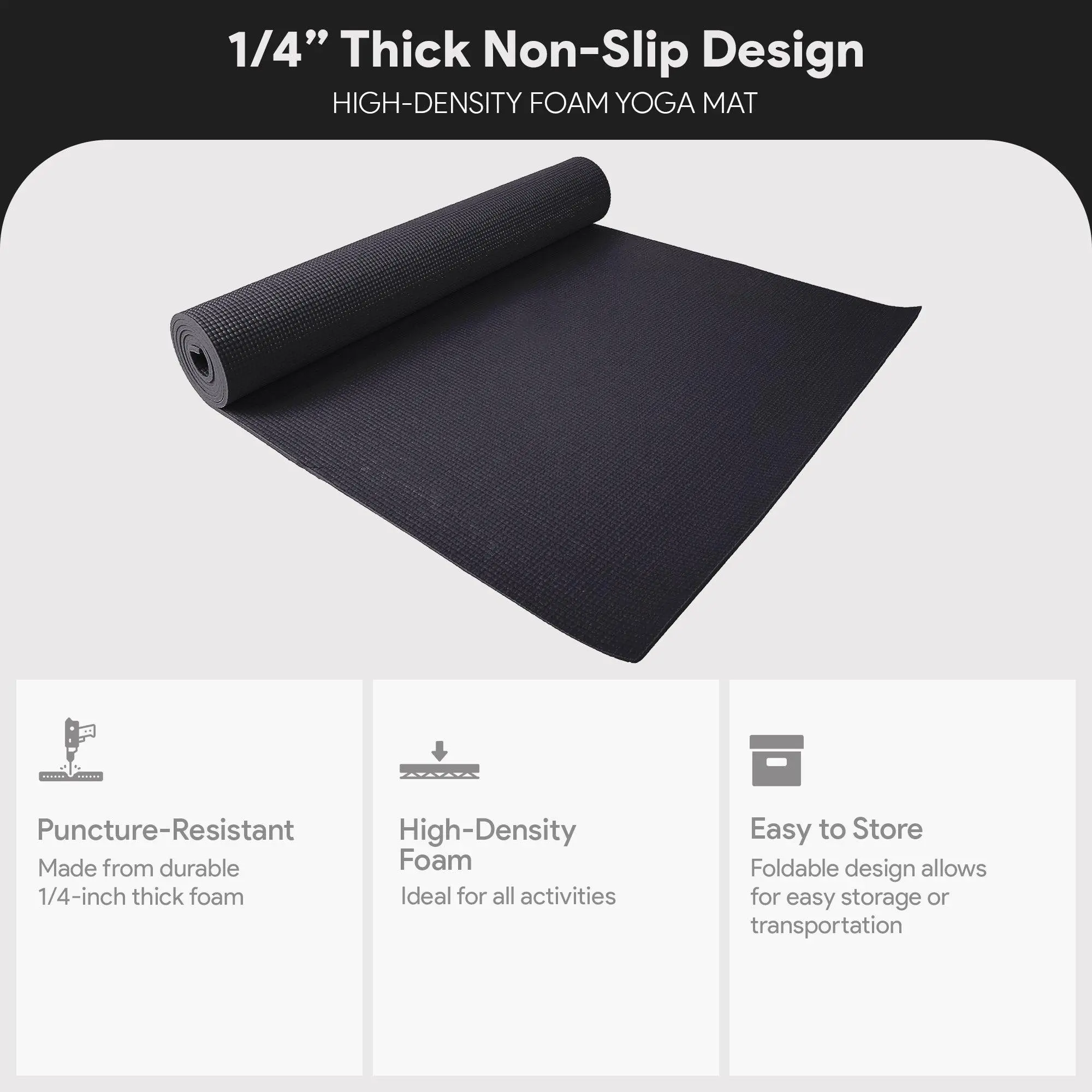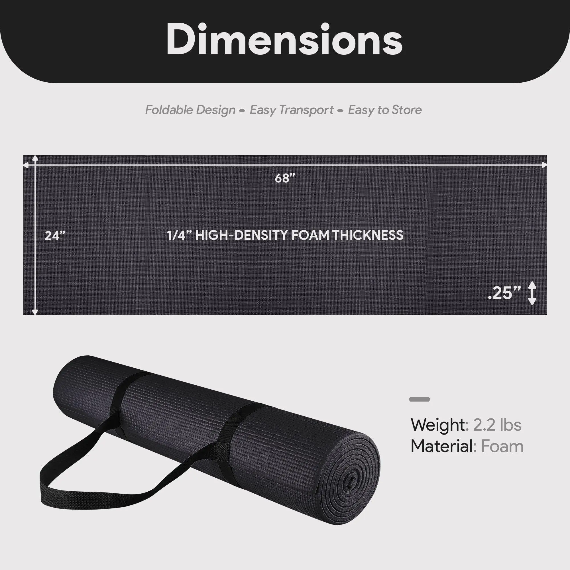 Unlock a world of wellness and comfort with the Non-Slip Yoga Mat with Carry Strap from Fitvids. Designed to elevate your practice, this mat offers unparalleled support and stability, making it the perfect companion for your fitness routine.Crafted with high-density foam, the workout mat provides exceptional cushioning to protect your joints and spine, ensuring a comfortable experience even during the most intense exercises. The 1/4-inch thick surface absorbs impact, allowing you to focus on your form and technique without worrying about discomfort.Boasting a double-sided non-slip design, this mat offers superior traction to keep you firmly in place, whether you're flowing through a vinyasa sequence or holding a challenging balance pose. The moisture-resistant technology ensures the mat stays clean and fresh, making it easy to wipe down after each use.Measuring 68 inches long and 24 inches wide, this mat offers ample space for full-body movements, accommodating users of all shapes and sizes. The lightweight and foldable design make it effortless to transport and store, allowing you to take your practice anywhere.Elevate your fitness routine with the Non-Slip Yoga Mat with Carry Strap from Fitvids. Crafted with the highest quality materials and designed to provide unparalleled support, this mat will become your trusted companion on your journey to physical and mental well-being. Experience the difference in your practice and unlock your full potential with our exceptional yoga equipment.