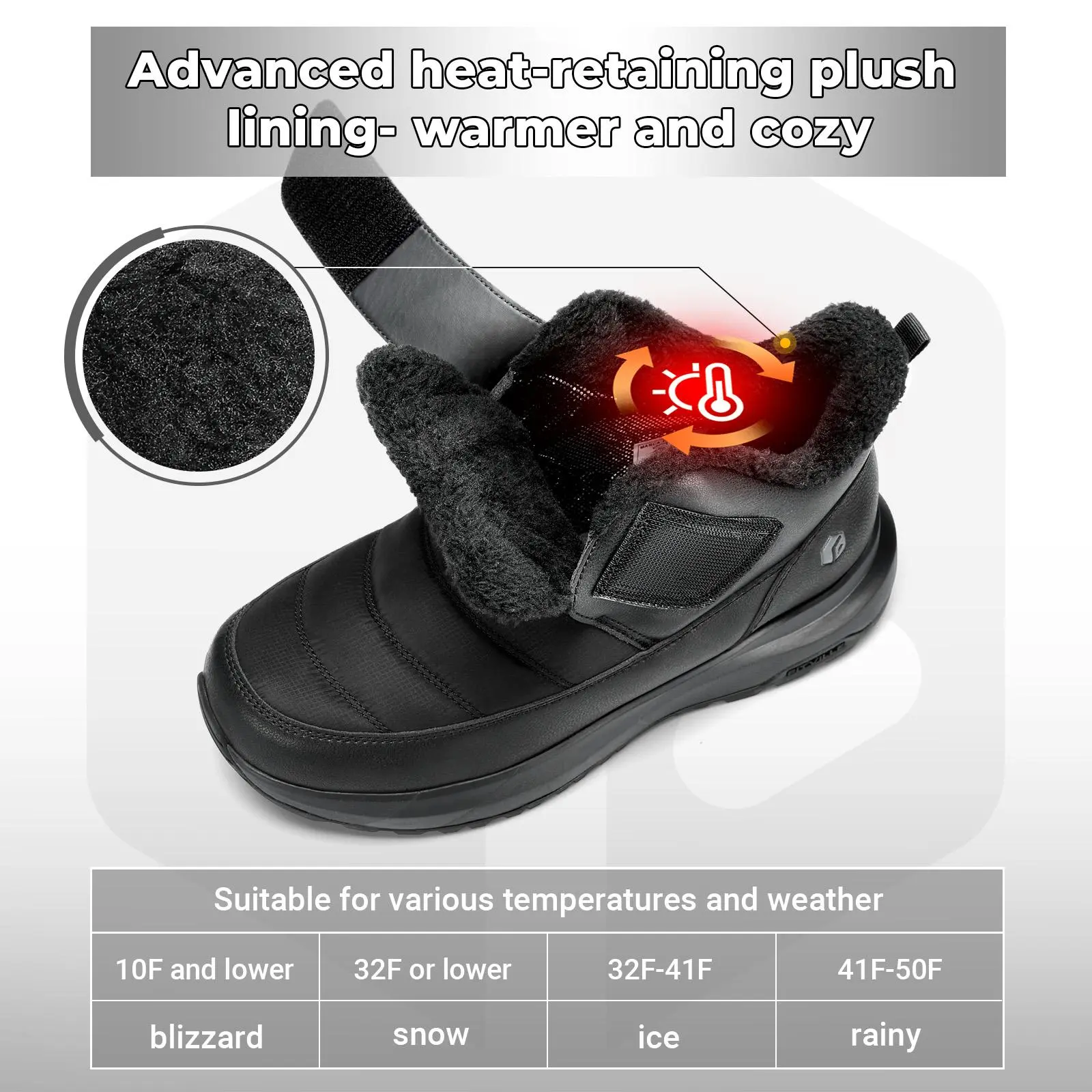 Mens extra wide winter boots with upgraded thermal lining capture and recycle body heat. The plush fleece interior and collar lock in cozy warmth without bulk. Stay warm without the bulk. 🌨️