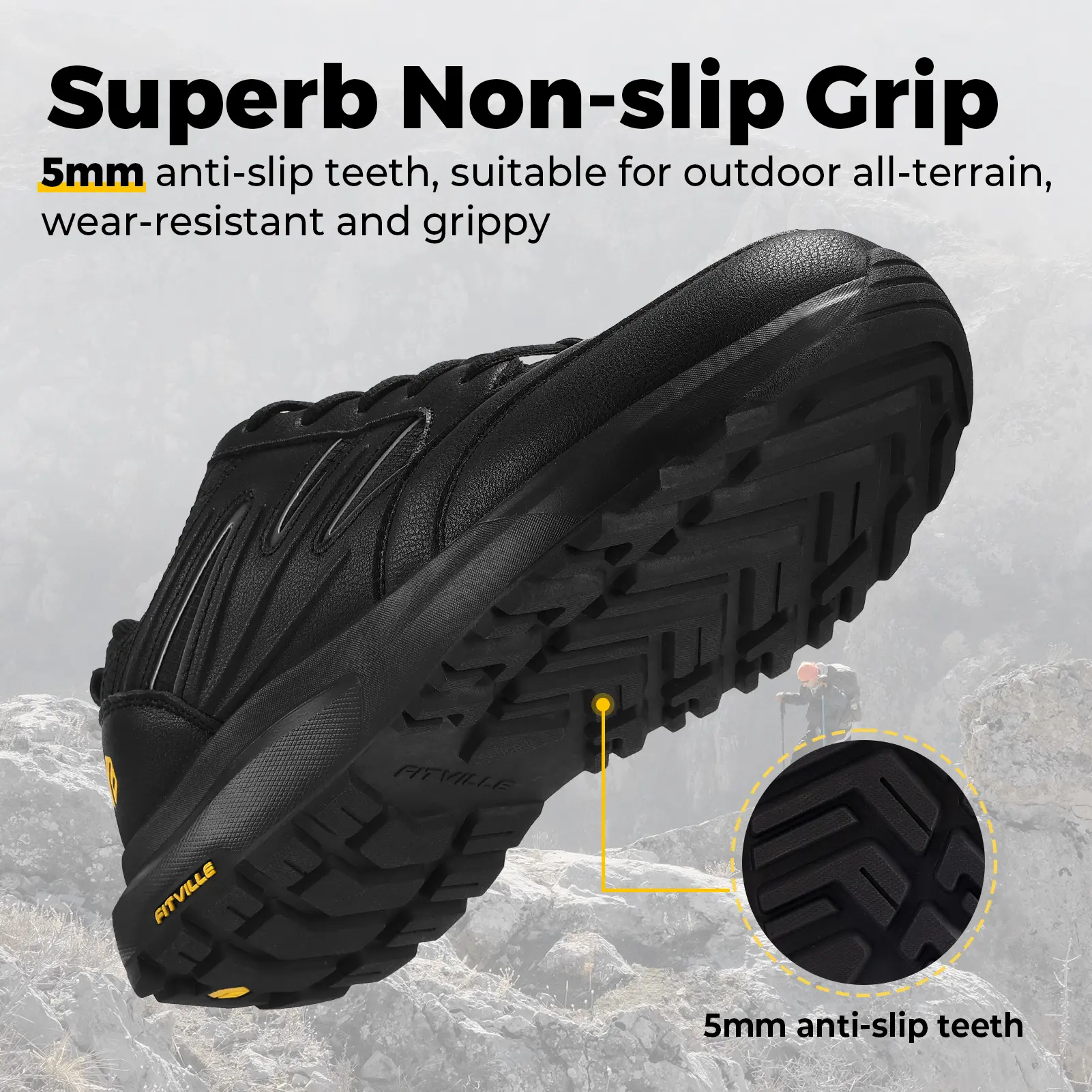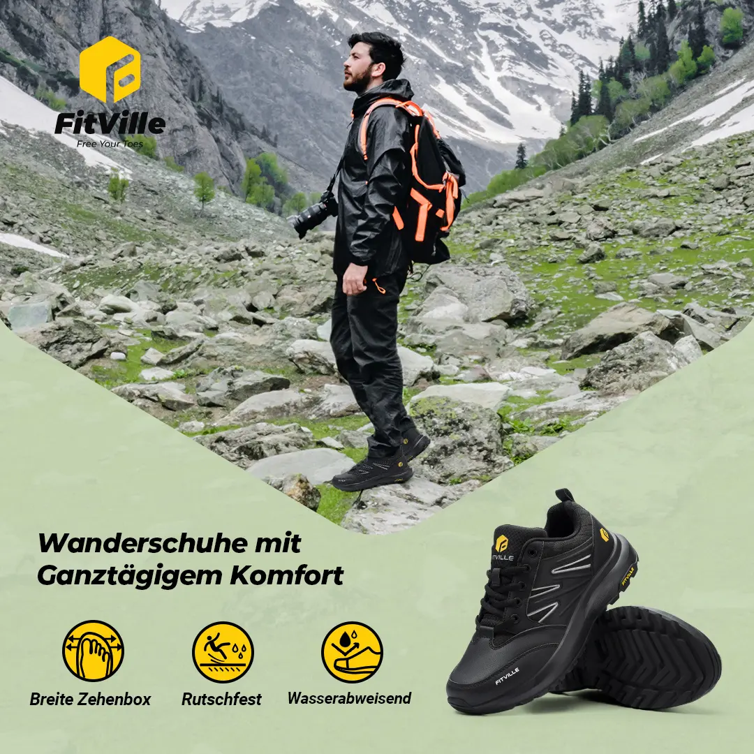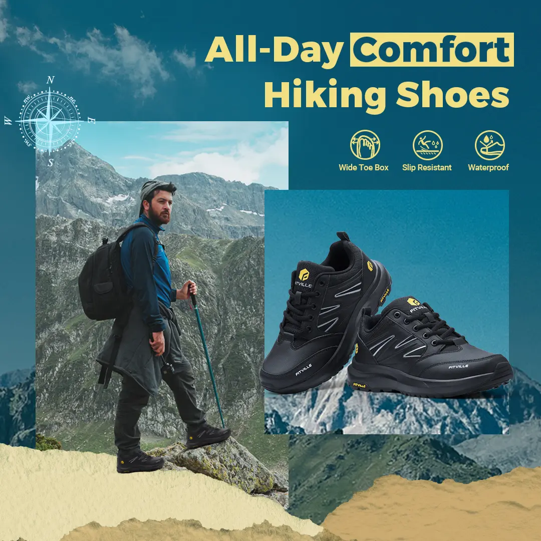 Escape to nature and reach new heights with FitVille’s Sturdy Core. A classic hiking shoe upgraded with an exciting low-top silhouette. Breathable and waterproof upper with a slip-resistant lug outsole, firmly built to overcome unexpected rainfall and slippery surfaces. Wide and Extra wide toe box offers ample space to accommodate swollen feet after long walks. Also, the EVA shock-absorption midsole provides all the support you need for the endless adventure ahead.