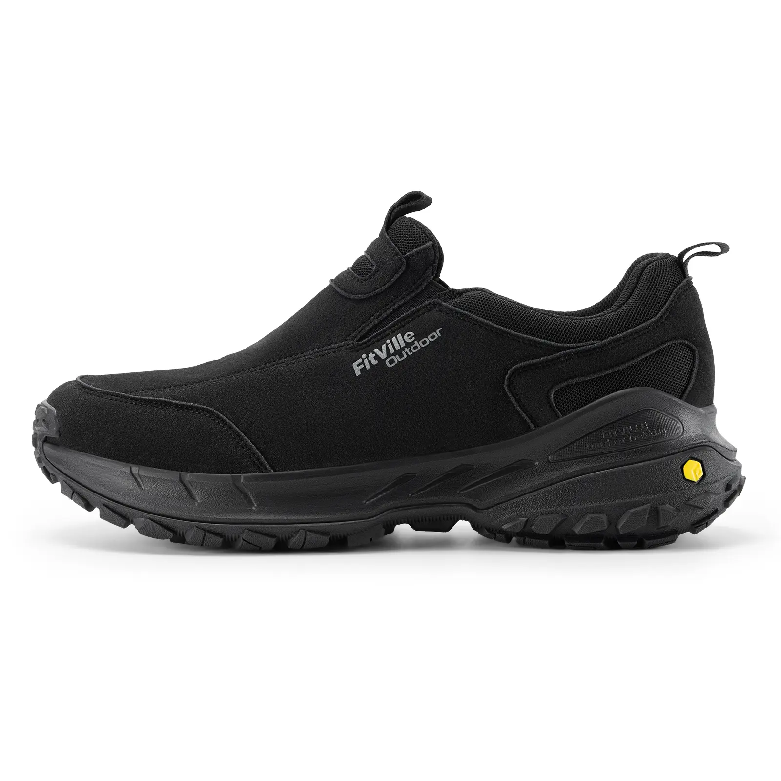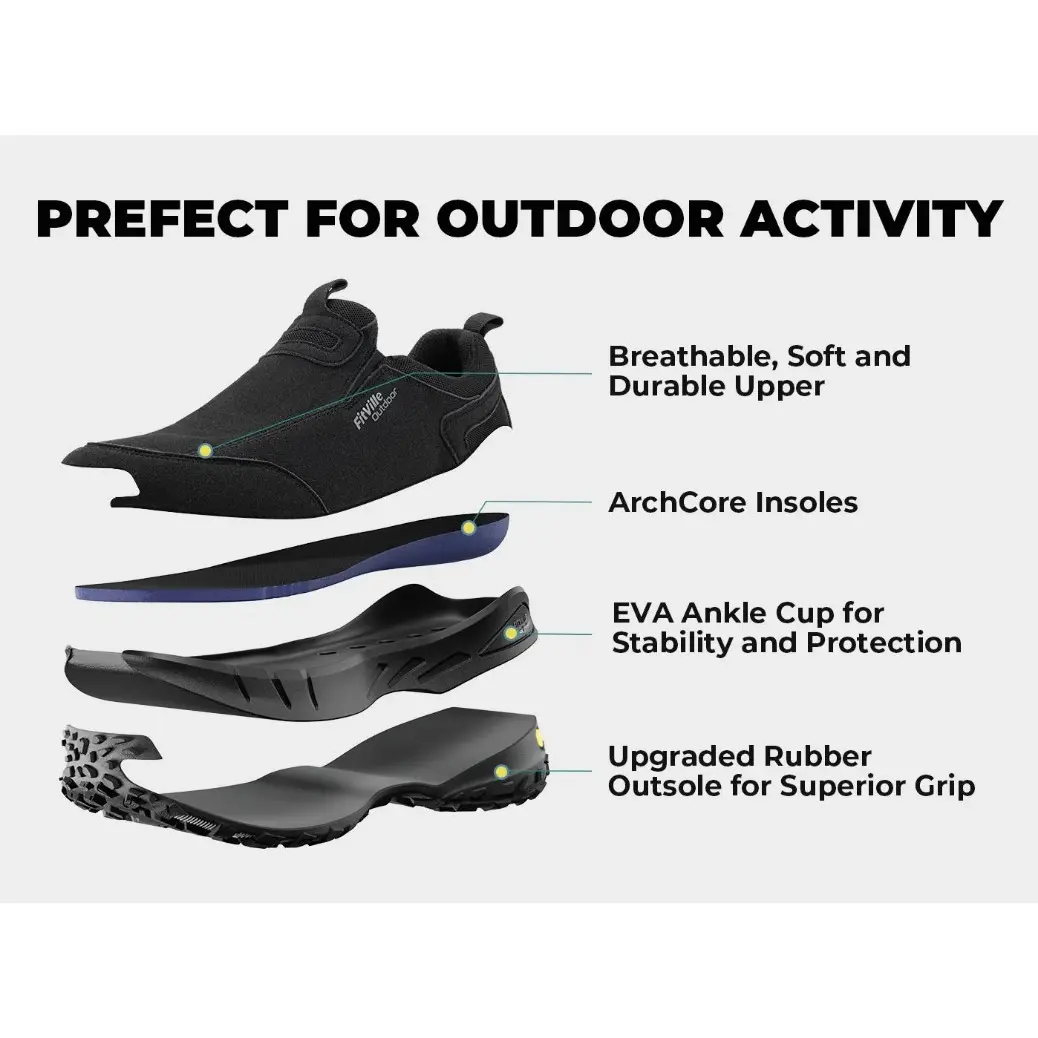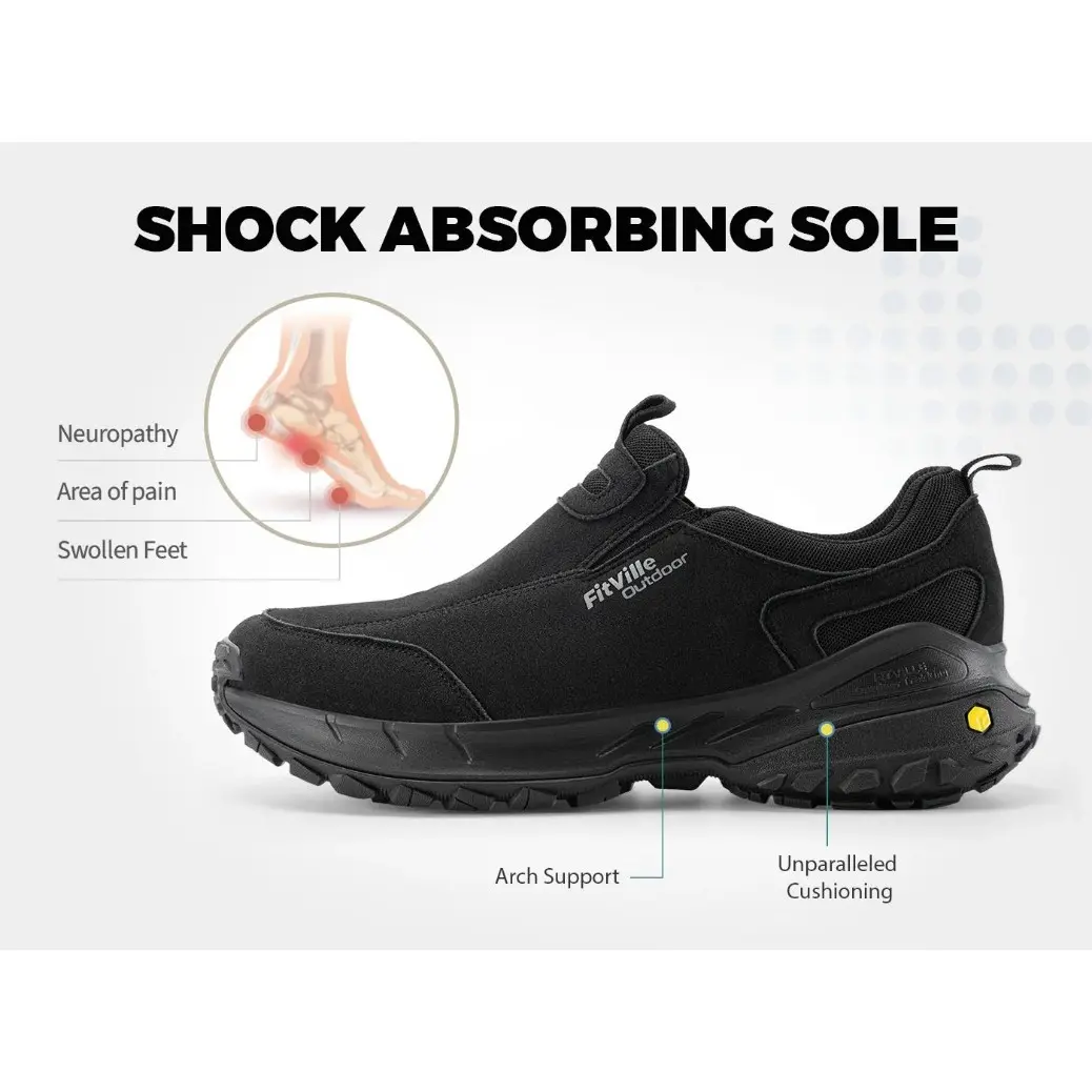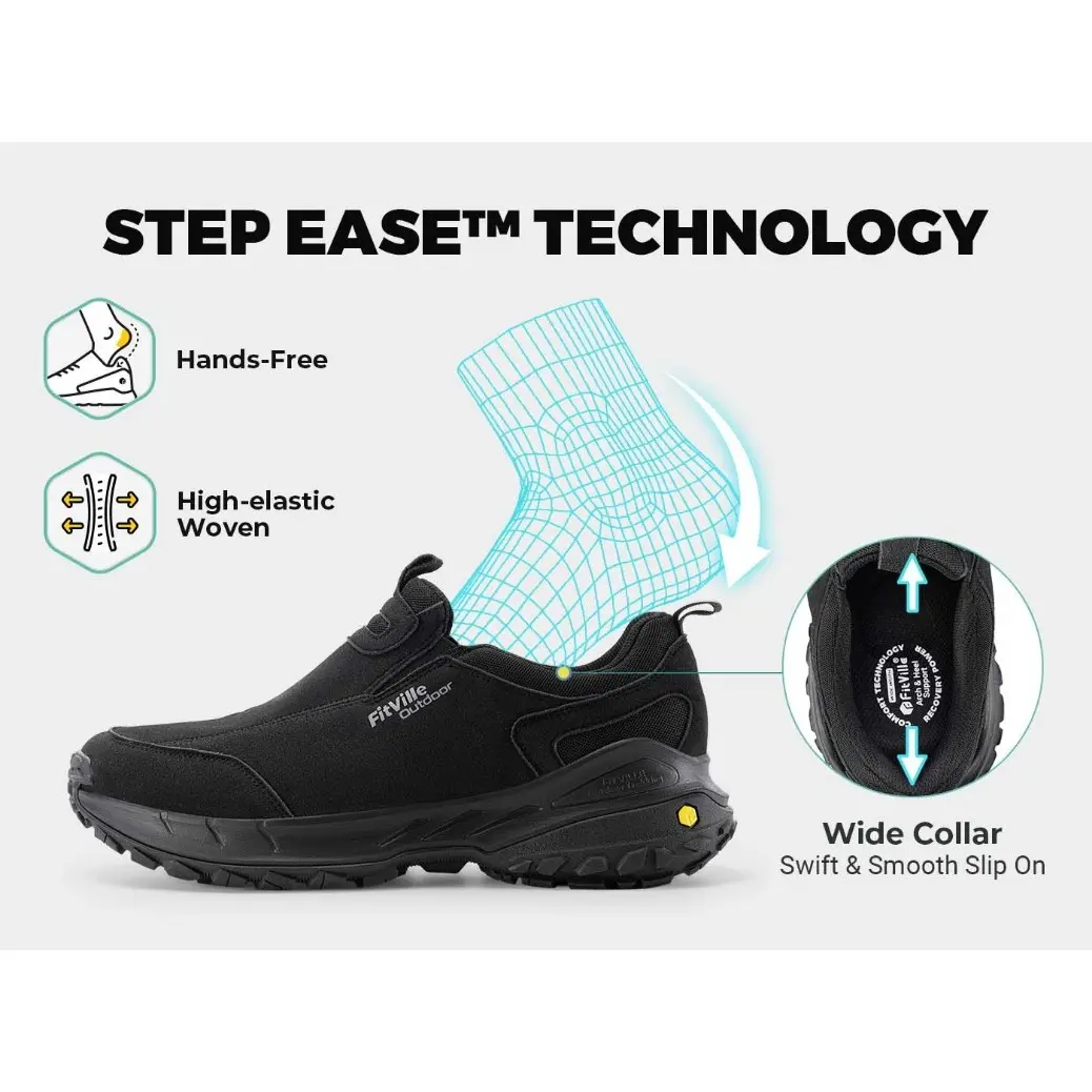 FitVille Men's Low-Top LugMax Outdoor Slip-On V3 is a versatile shoe designed for comfort, performance, and durability. With its waterproof and breathable upper, slip-resistant outsole, and wide toe box, it is perfect for hiking, running, and casual wear. The patented EVA midsole ensures stable support and shock absorption, making it ideal for long expeditions.