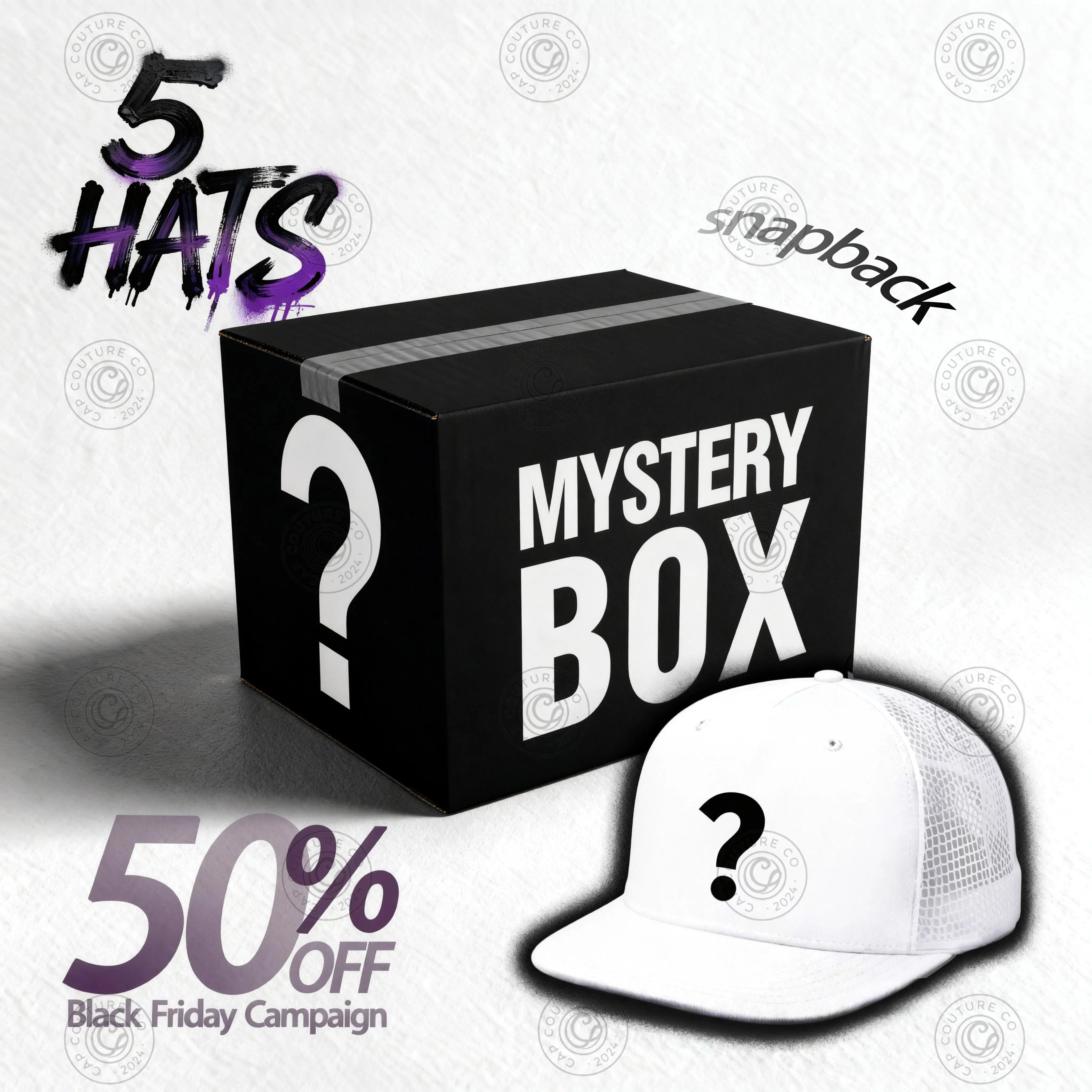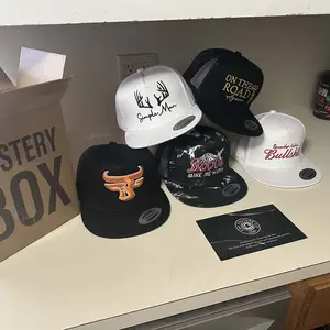 Looking to add a touch of surprise to your wardrobe? This mystery box contains three different styles of hats: 1. Trucker hat, 2. Curved brim 112 hat, and 3. Flat brim hat (all made of fabric). Each box contains five carefully selected, high-quality adjustable hats, randomly chosen from 108 unique designs, each with its own distinct color and style. Each design has a 1/108 chance of appearing, making every box full of surprise and mystery. Each hat is valued at $34.25.