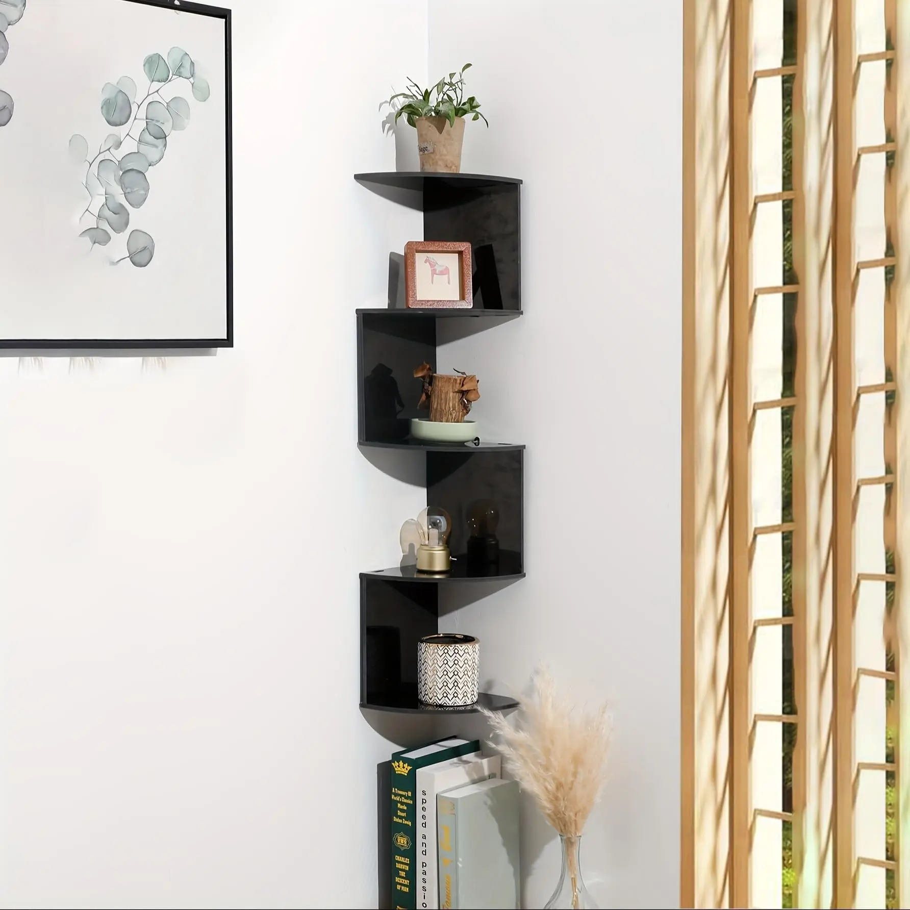 【Space-Saving Design】: This five-tier floating corner bookshelf maximizes space in bedrooms, living rooms, bathrooms, and home offices.