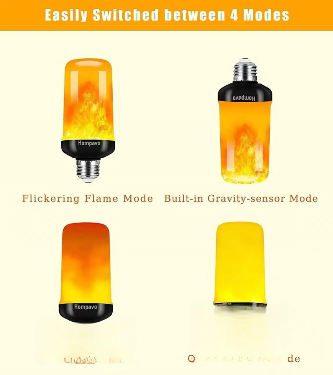 Our LED light bulbs offer four modes: flickering flame, breathing, general light, and upside down. The flame automatically switches direction. By repeating the on-off switch, you can change the effect. This versatile feature allows you to customize the ambiance to your liking.