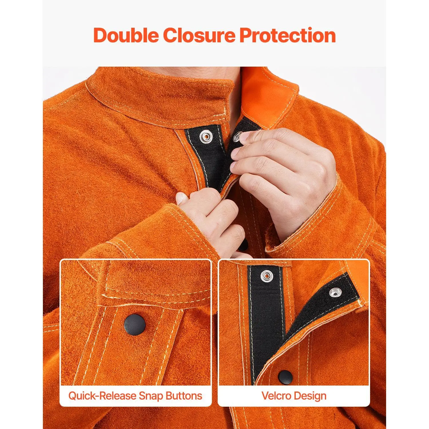 ·Enhanced Protection: The combination of heat-resistant snap buttons and velcro closures ensures a snug fit and enhanced seal, blocking high temperatures and sparks. And the adjustable cuffs and turn-down collar further protect your neck and wrists for added safety.