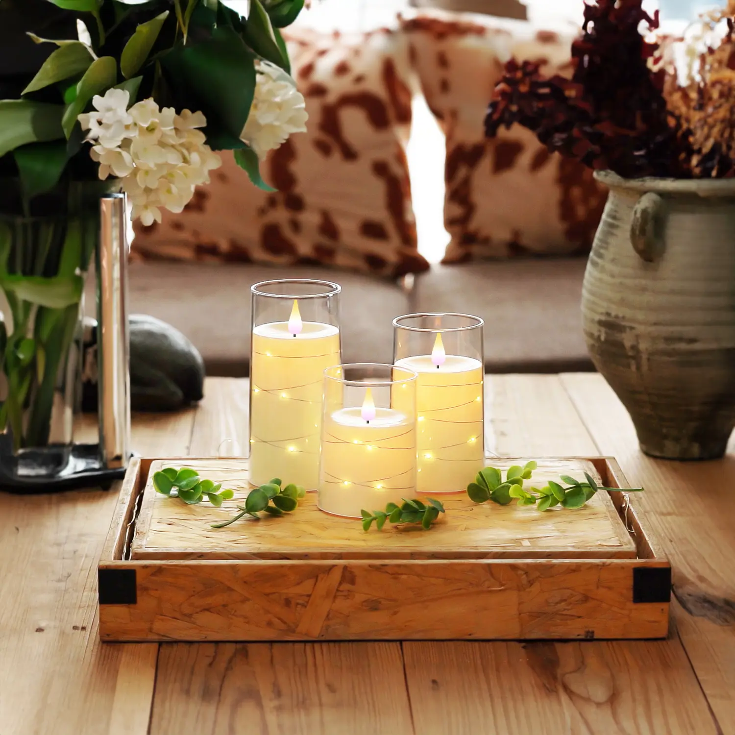 ·Flameless candles with embedded star string fairy lights.
