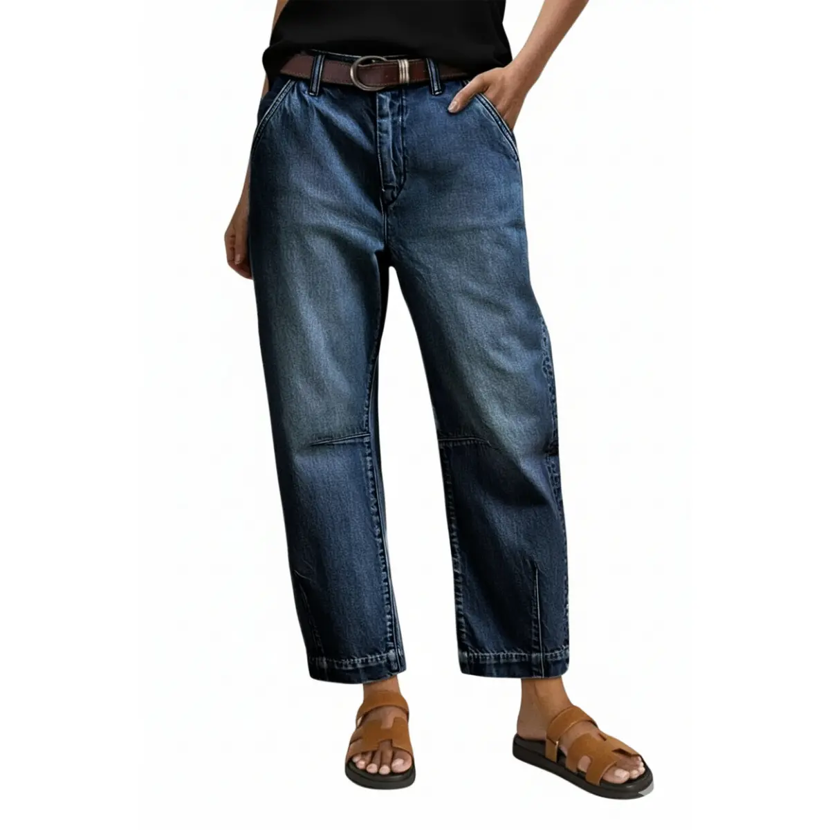 These jeans feature a modern barrel-leg silhouette with a relaxed shape and a gently tapered hem. They are intentionally roomy through the leg, shaped at the knee, and designed to create a polished, modern look.