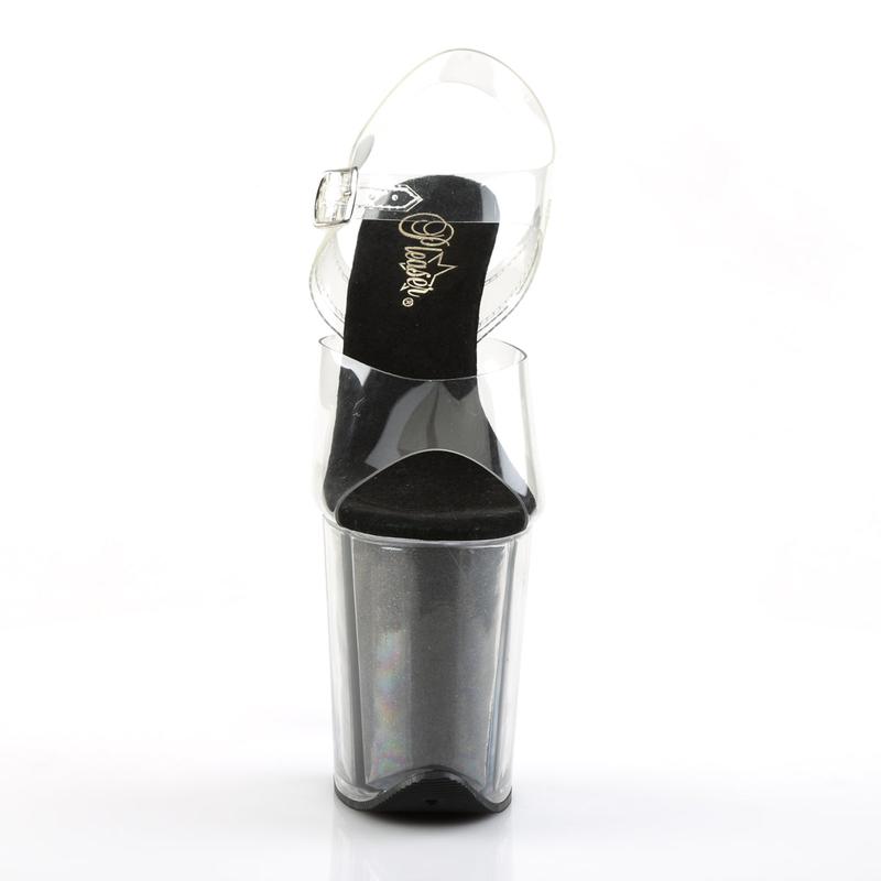 Step into the spotlight with the Flamingo-808G, a striking ankle strap sandal that embodies both glamour and height. Featuring an impressive 8-inch heel and a dazzling 4-inch platform with glitter inserts, these sandals are designed to catch the light and eyes in any room. The elegant clear and black design adds a touch of sophistication, making these shoes perfect for those who love to stand out. Ideal for special occasions or nights out, the Flamingo-808G will complement any ensemble with a luxurious flair.