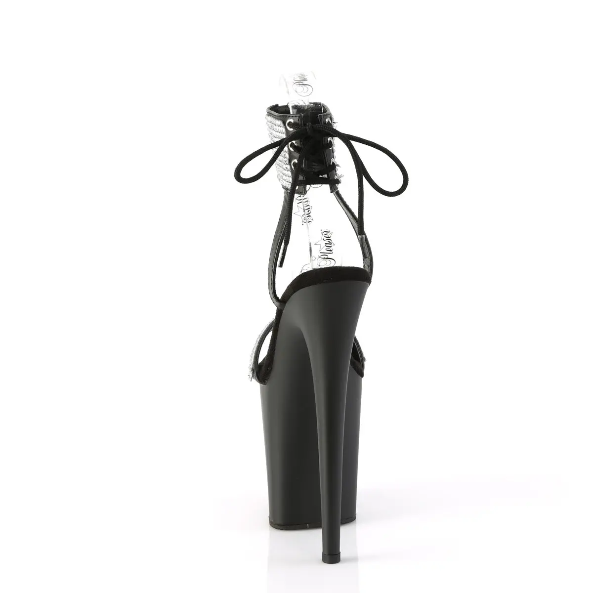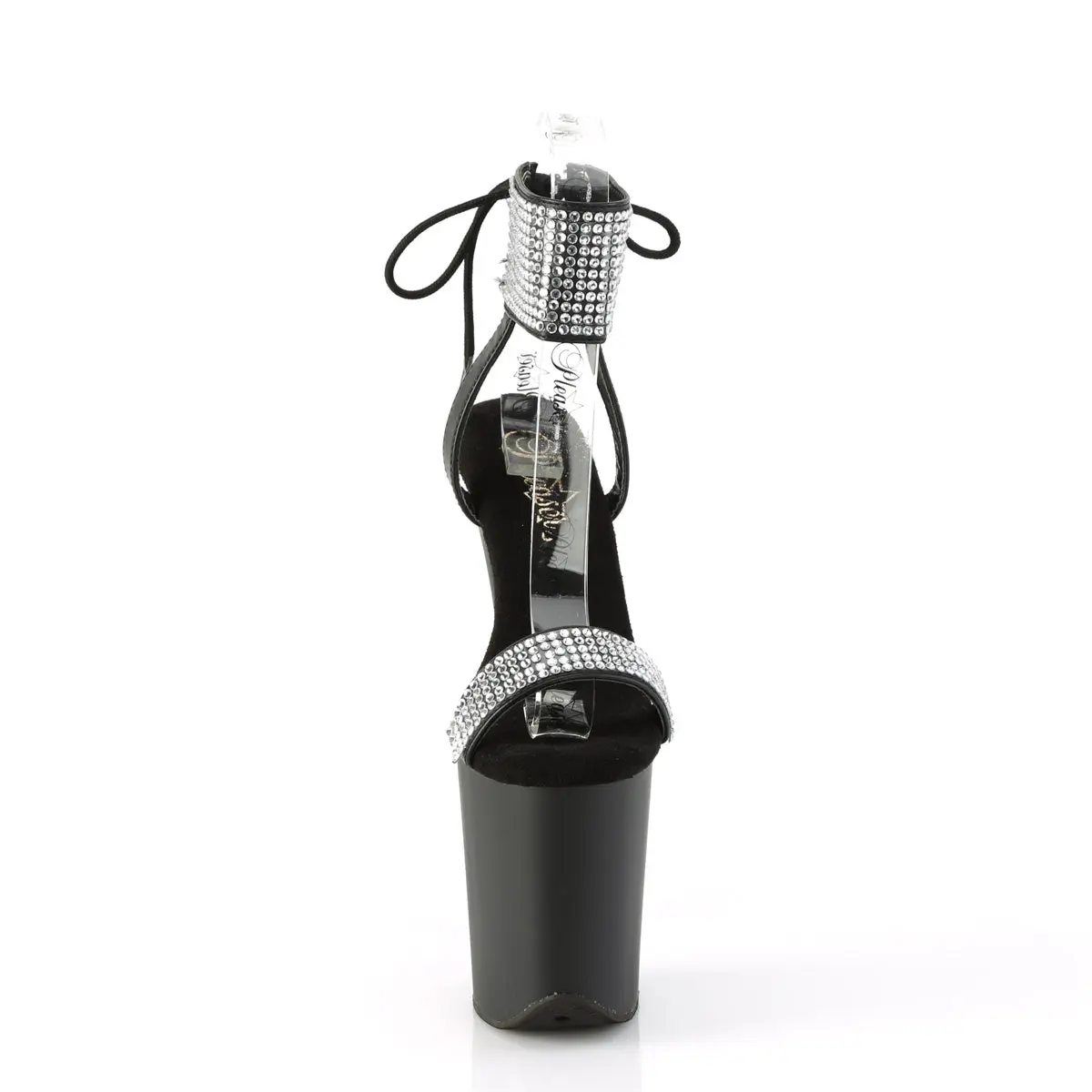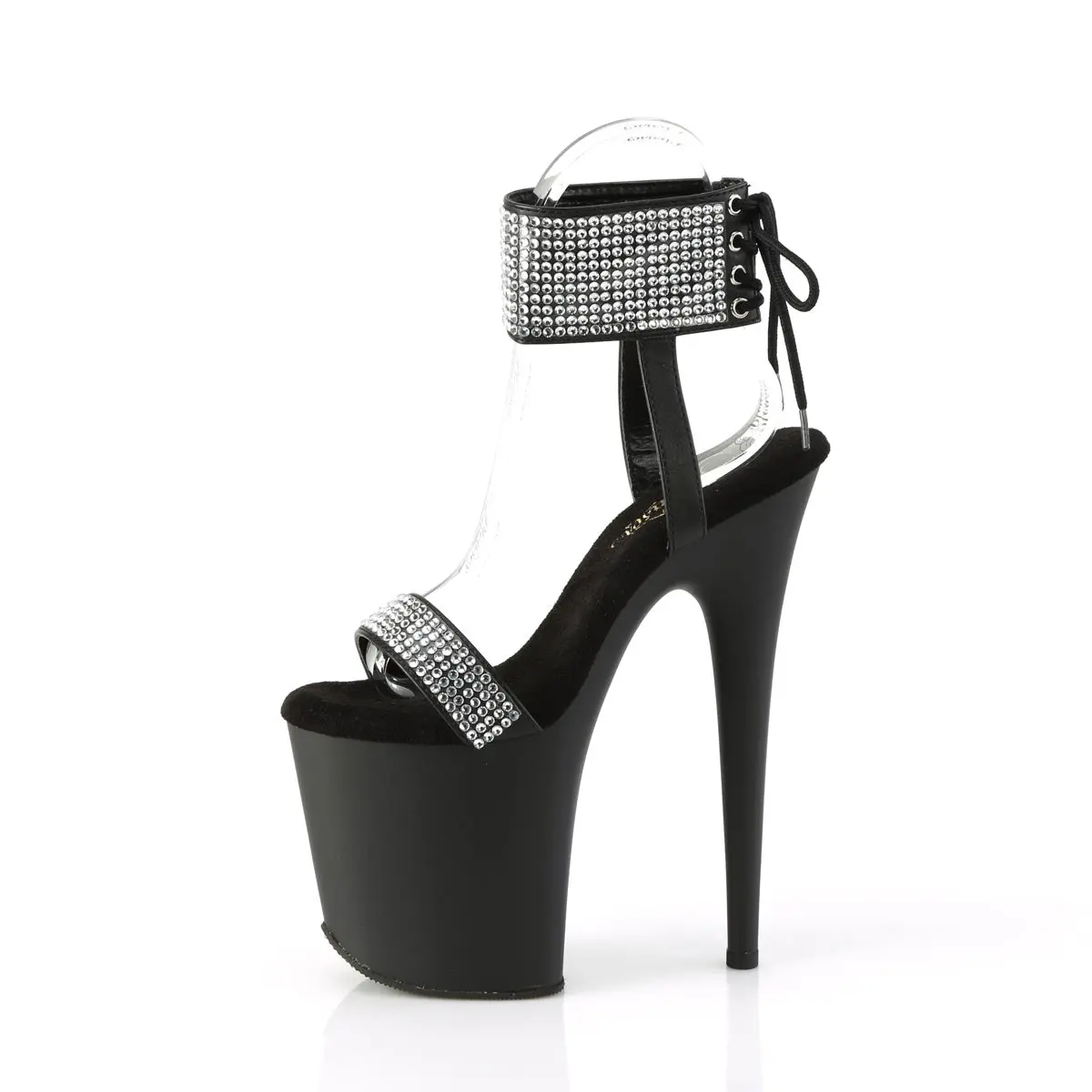 Meet the Flamingo-870 Sandals, a dazzling pair that stands tall with an 8-inch heel and 4-inch platform. Designed in sophisticated black vegan leather, these sandals shine with rhinestone-embellished ankle cuffs and toe straps. The unique back-tie detail offers a distinctive and stylish finish, making these shoes a prime choice for anyone looking to add a touch of glamour to their wardrobe. Step into these head-turning Flamingo-870 Sandals and elevate your outfit with their bold, sparkling design.