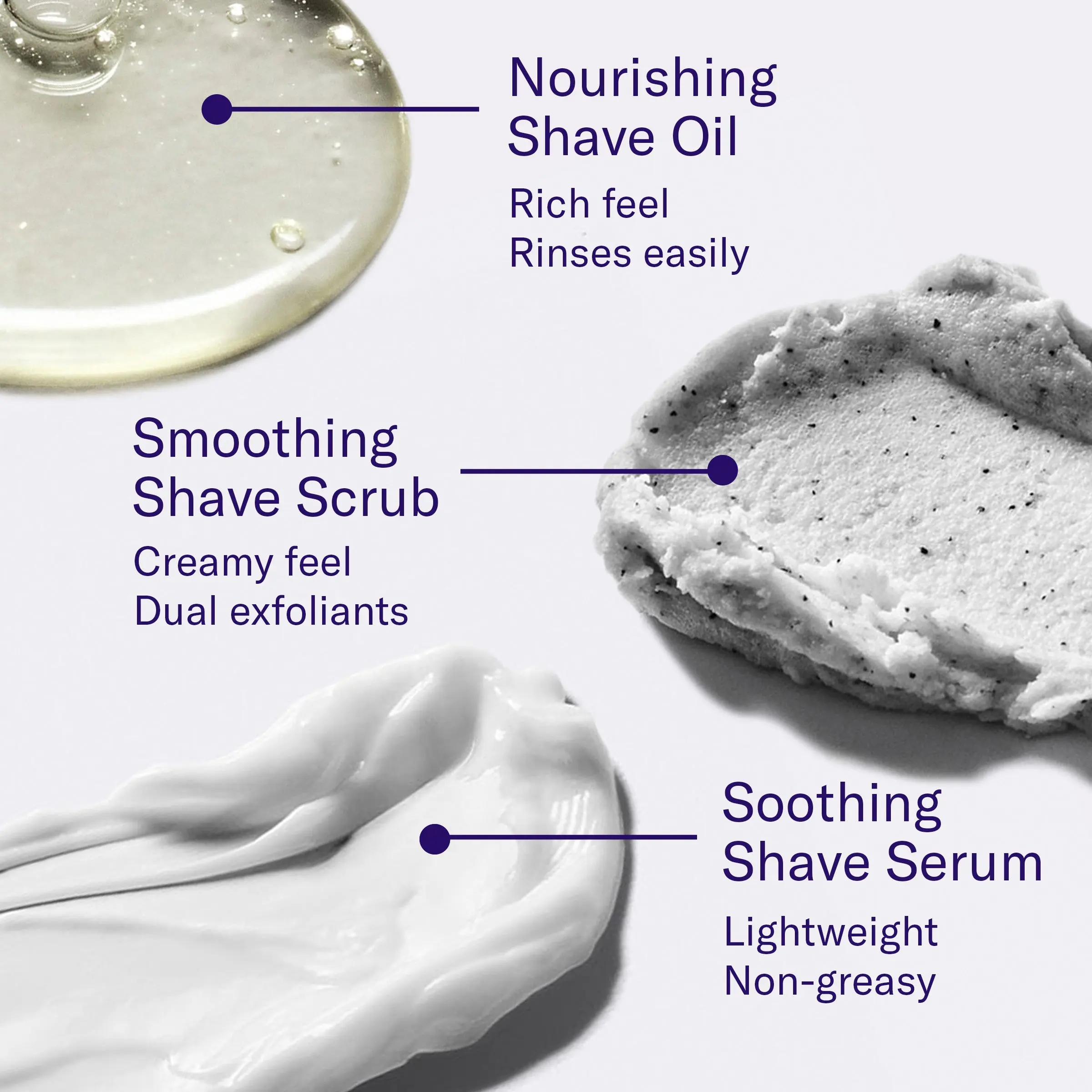 | Ingredients | Smoothing Shave Scrub: Water/Aqua/Eau,Hydrated Silica,Glyceryl Stearate Se,Pumice,Caprylic/Capric Triglyceride,Cetearyl Alcohol,Sucrose,Salix Alba (Willow) Bark Extract,Stearic Acid,Palmitic Acid,Cocos Nucifera (Coconut) Shell Powder,Cocos Nucifera (Coconut) Oil,Maltodextrin,Fragrance (Parfum),Butyrospermum Parkii (Shea) Butter,Ceteareth-20,Caprylyl Glycol,Phenoxyethanol,Limonene,Hexyl Cinnamal. Nourishing Shave Oil: Water/Aqua/Eau,Propanediol,Coconut Oil Glycereth-8 Esters,Cocamidopropyl Betaine,Lauric Acid,Peg-120 Methyl Glucose Dioleate,Fragrance/Parfum,Argania Spinosa Kernel Oil,Persea Gratissima (Avocado) Oil,Polyquaternium-67,Glyceryl Oleate,Disodium Cocoamphodiacetate,Hydrogenated Palm Glycerides Citrate,Coco-Glucoside,Lauryl Glucoside,Citrus Aurantium Peel Oil,Citrus Limon Peel Oil,Tocopherol,Citric Acid,Potassium Hydroxide,Polysorbate 20,Chlorphenesin,Tetramethyl Acetyloctahydronaphthalenes,Hydroxycitronellal. Soothing Shave Serum: Water/Aqua/Eau,Glycereth-26,Sodium Hyaluronate,Zingiber Officinale (Ginger) Root Extract,Bisabolol,Allantoin,Lactobacillus Ferment,Sodium Pca,Fructose,Glucose,Maltose,Trehalose,Polyglyceryl-6 Stearate,Sodium Lactate,Polyglyceryl-6 Behenate,Pentylene Glycol,Ammonium Acryloyldimethyltaurate/Vp Copolymer,Acrylates/C10-30 Alkyl Acrylate Crosspolymer,Sodium Chloride,Sodium Hydroxide,Urea,Pentaerythrityl Tetra-Di-T-Butyl Hydroxyhydrocinnamate,Ethylhexylglycerin,Hexyl Cinnamal,Linalool,Geraniol. |