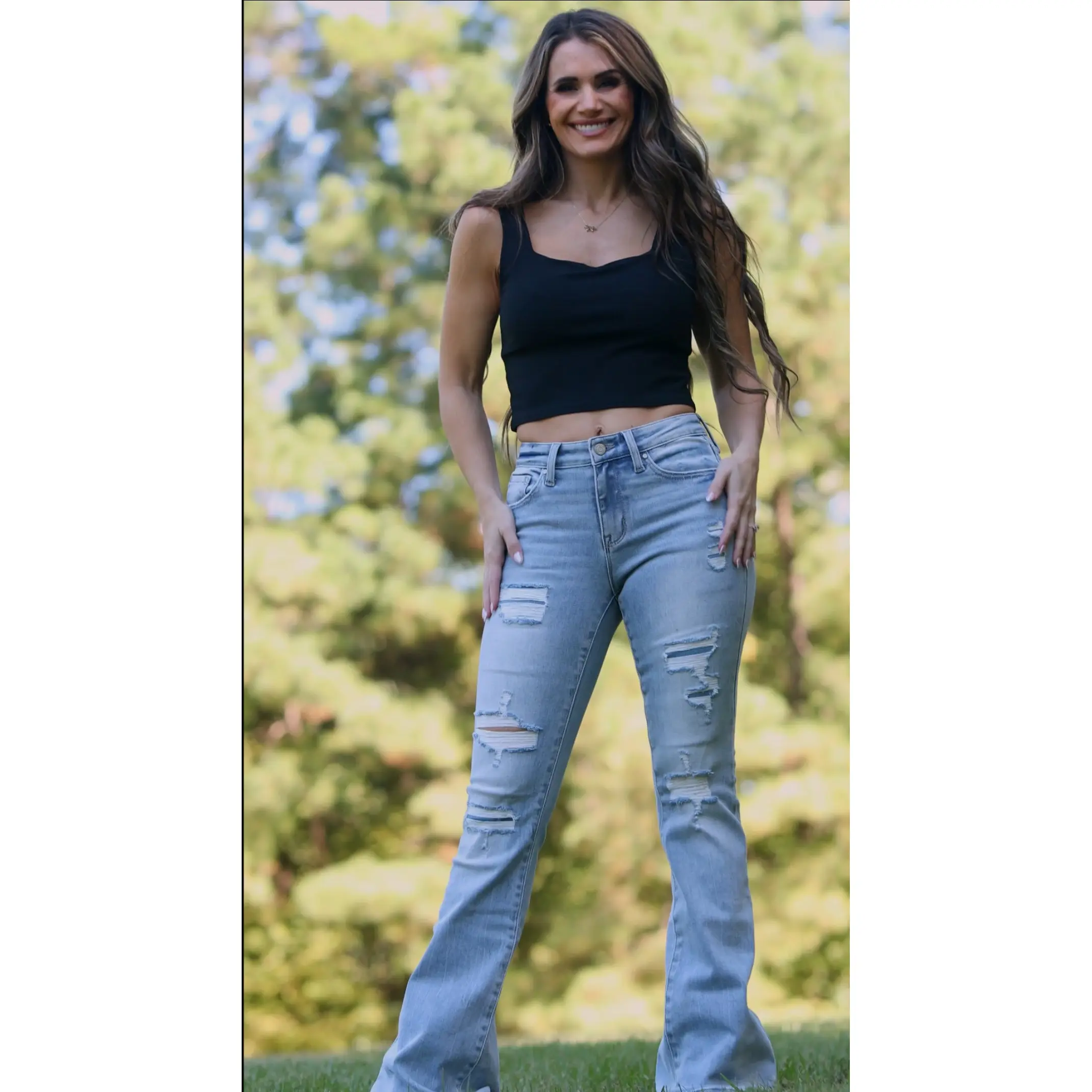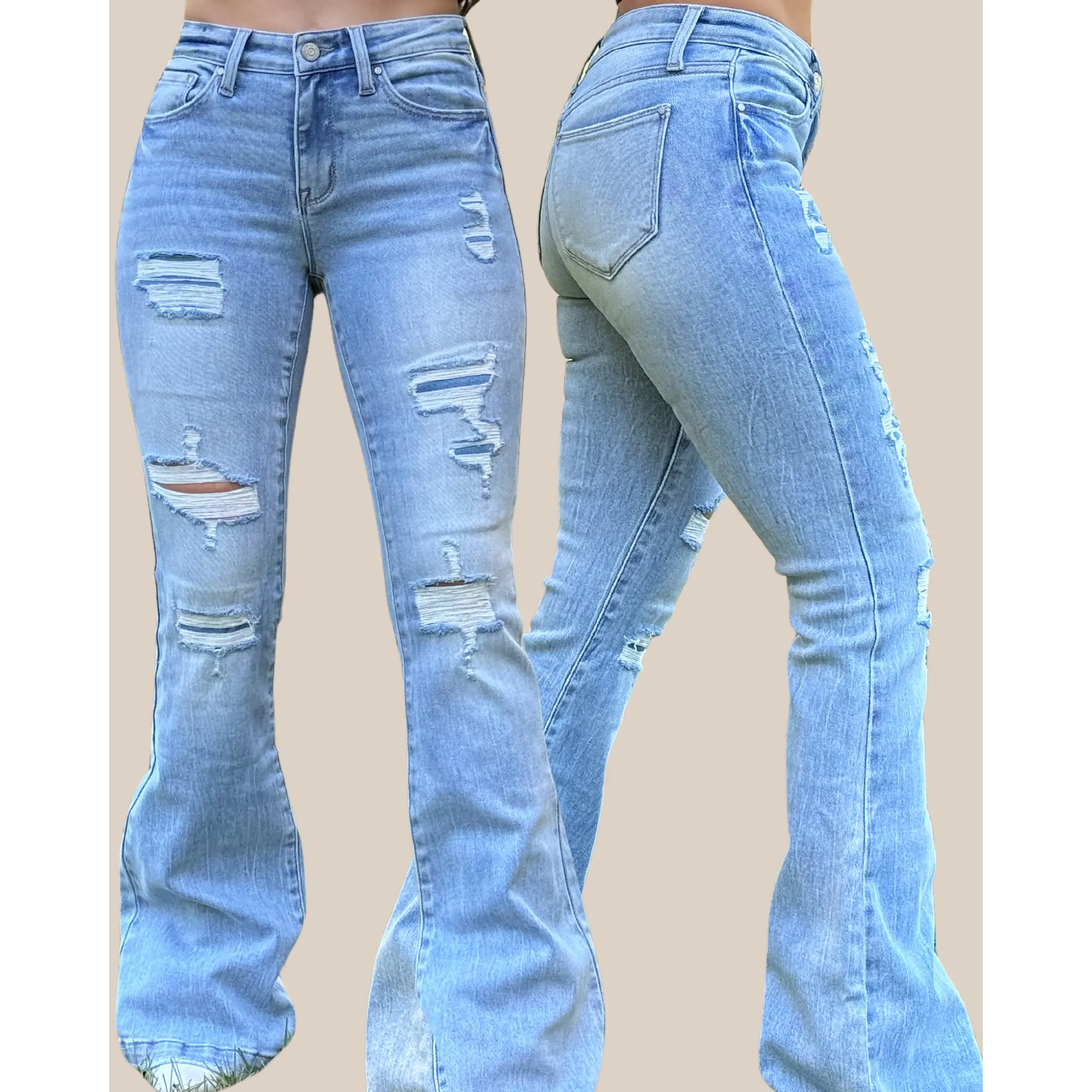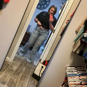 I love these they are the prefect light wash color, the bell bottom goatee is perfect and the holes or patch work is absolutely my style...I couldn't be more pleased with a pair of jeans!! Woooowhoooo♡