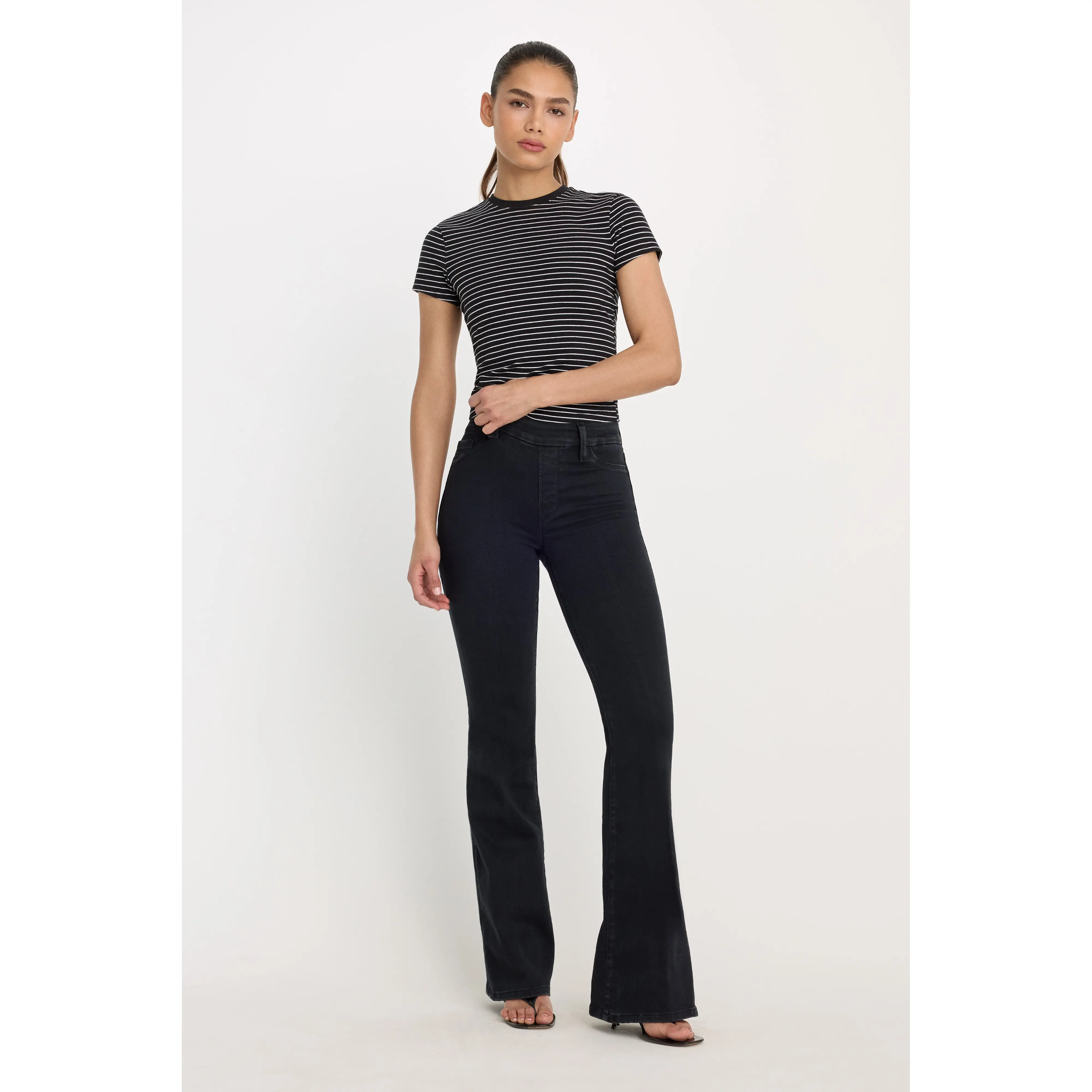 No zipper, no button – these pull-on jeans are the sexiest ever. Crafted from innovative denim, they offer curve-loving stretch and next-level body sculpting. High-rise and flared legs add a stylish touch. Faux pockets and a gap-proof waistband ensure comfort. Reinforced belt loops and tummy smoothing technology complete the look.