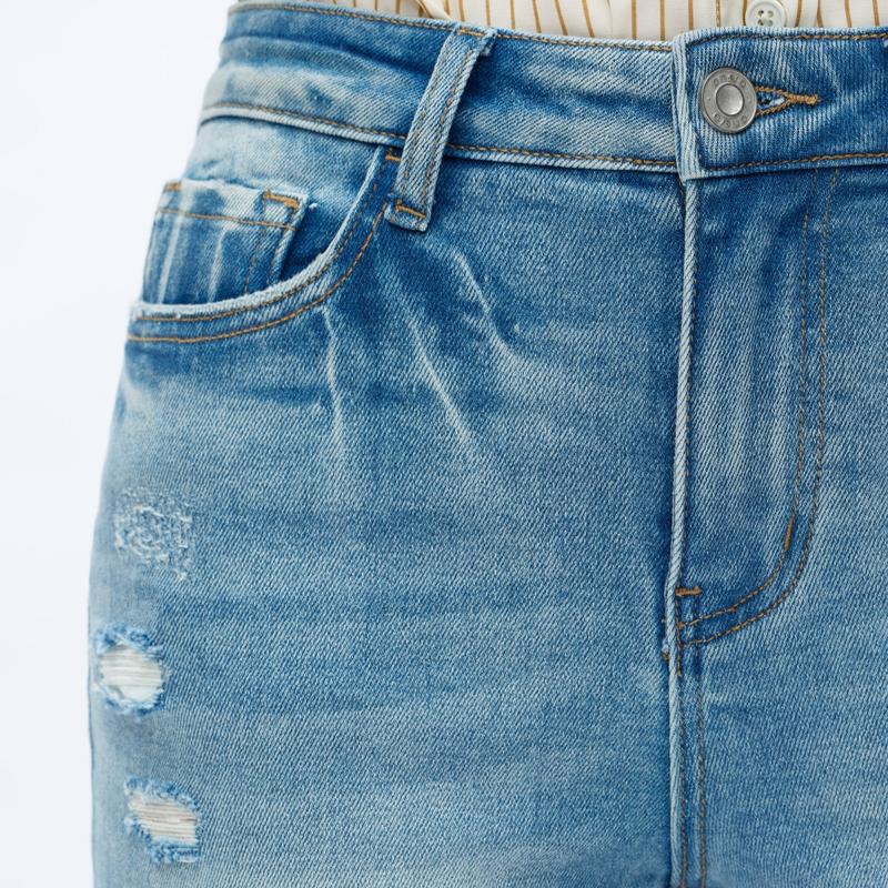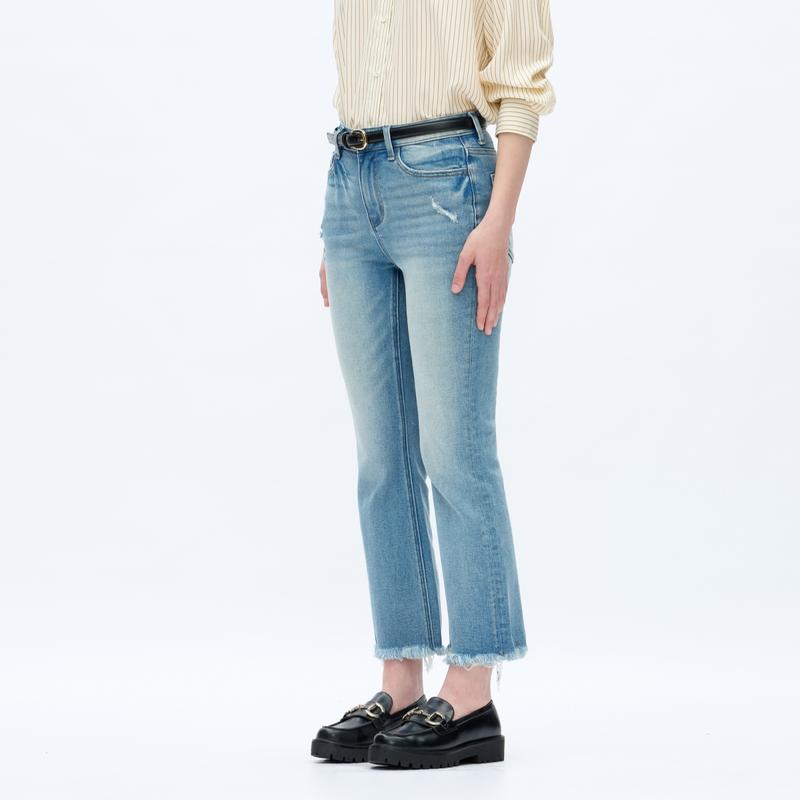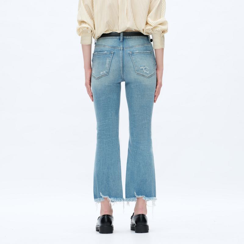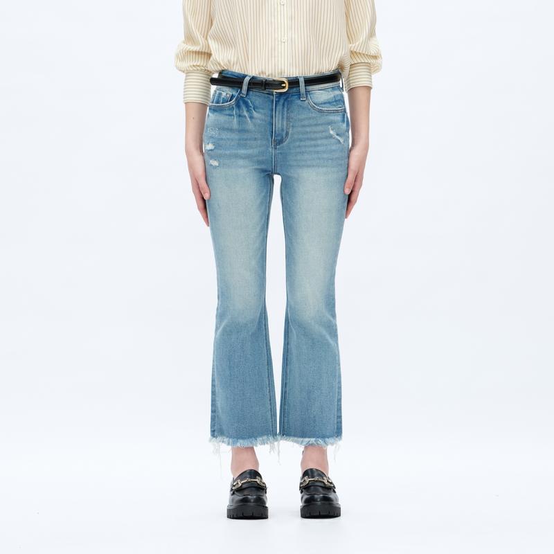 Fabric: With Stretch Composition: 90.5%Cotton, 7.5%Poyester, 2%Spandex     Waist Line: High Waist Type: FlareJeans Fit: Regular Fit Closure Type: Zipper Fly Details: Button, Pocket, Zipper Design Features: Raw Hem, Distressed